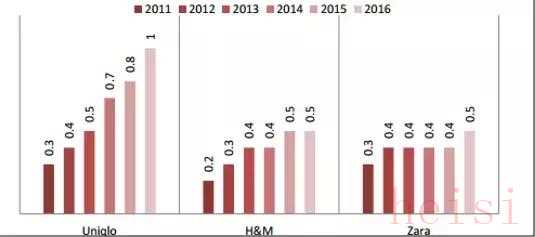 來自Euromonitor 的數(shù)據(jù)顯示,2012 年至 2016 年間,ZARA、優(yōu)衣庫、H&M 三大品牌在中國市場占有率均快速提升。但是從2014年開始,優(yōu)衣庫一舉超過ZARA市占率位列第二,僅次于中國本土品牌海瀾之家。