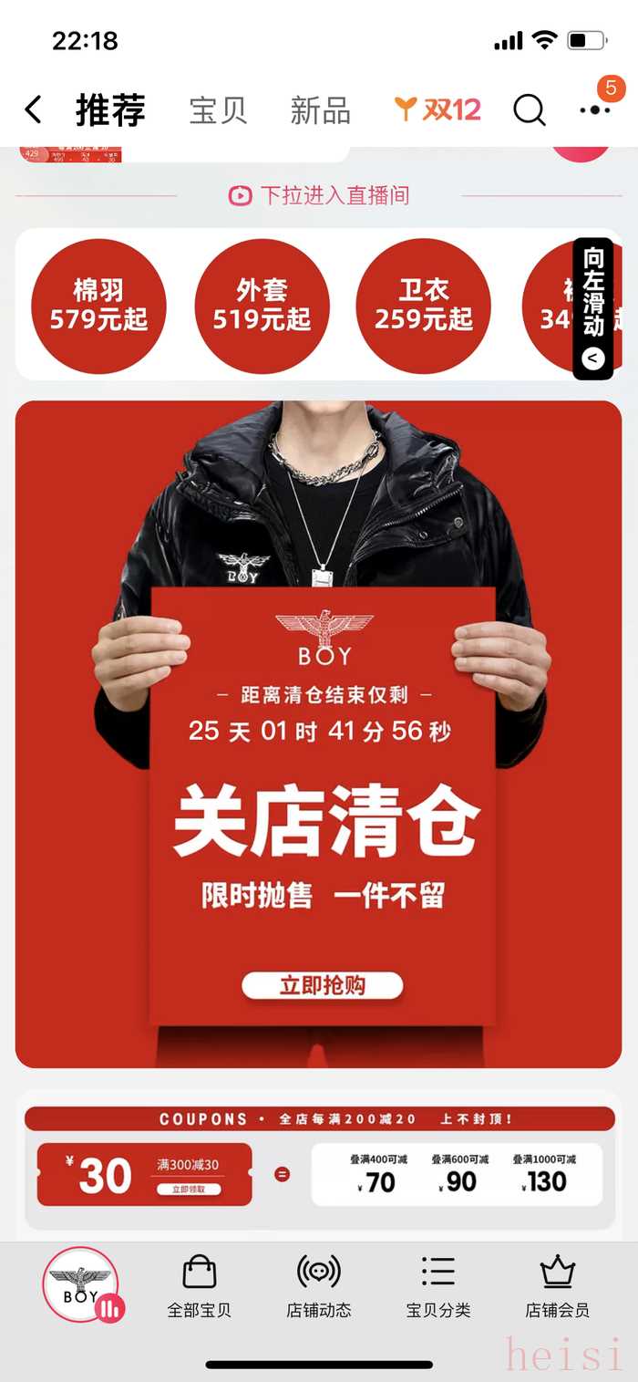 新黃河記者發(fā)現(xiàn),為了盡快清倉拋售,該品牌在兩個(gè)平臺(tái)的店鋪都設(shè)置了3折、4折、5折專區(qū)以及清倉秒殺專區(qū),并提供了多種滿減券,優(yōu)惠力度大,涉及產(chǎn)品包括御寒棉羽、潮搭外套、經(jīng)典衛(wèi)衣、當(dāng)季毛衣、休閑褲裝等,產(chǎn)品標(biāo)示圖的右上角都有“關(guān)店清倉”的字樣。