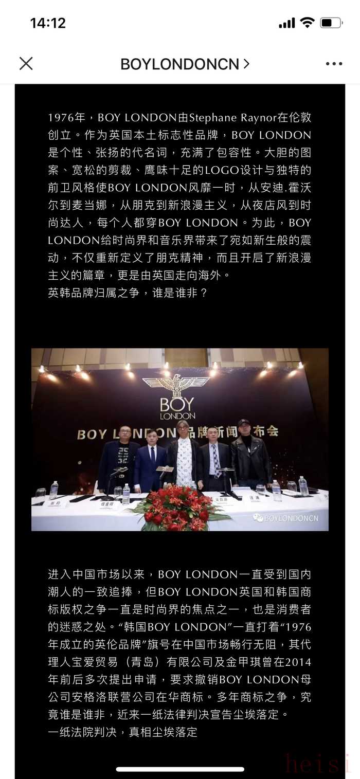 根據(jù)BOYLONDONCN微信公眾號(hào)顯示,進(jìn)入中國(guó)市場(chǎng)以來,BOYLONDON一直受到國(guó)內(nèi)潮人的一致追捧,但BOYLONDON英國(guó)和韓國(guó)商標(biāo)版權(quán)之爭(zhēng)一直是時(shí)尚界的焦點(diǎn)之一,也是消費(fèi)者的迷惑之處?!绊n國(guó)BOYLONDON”一直打著“1976年成立的英倫品牌”旗號(hào)在中國(guó)市場(chǎng)暢行無阻,其代理人寶愛貿(mào)易(青島)有限公司及金甲琪曾在2014年前后多次提出申請(qǐng),要求撤銷BOYLONDON母公司安格洛聯(lián)營(yíng)公司在華商標(biāo)。