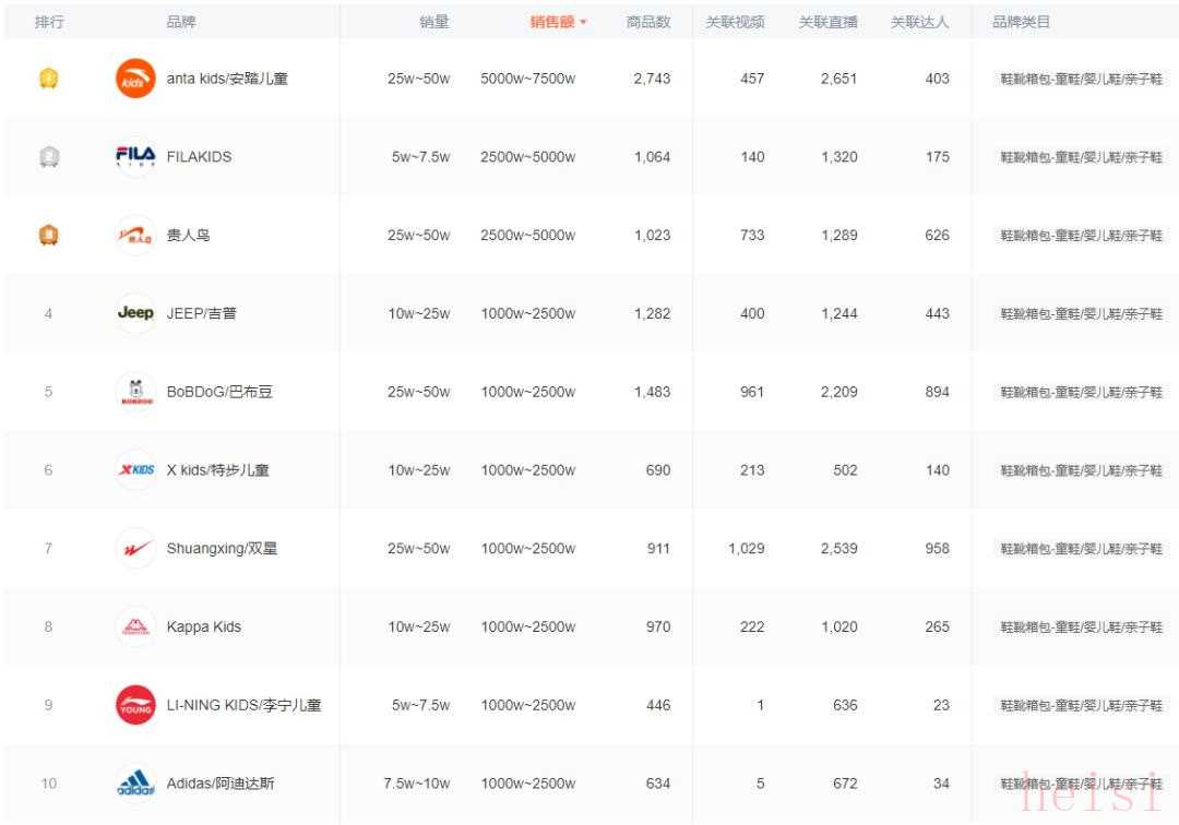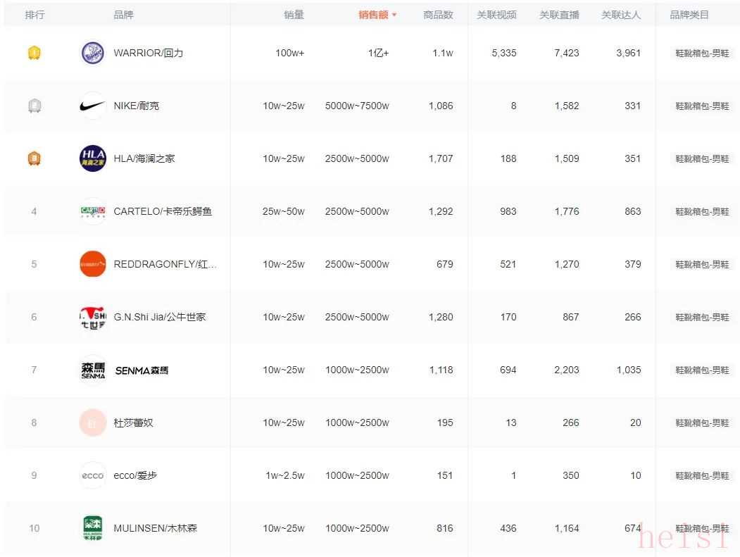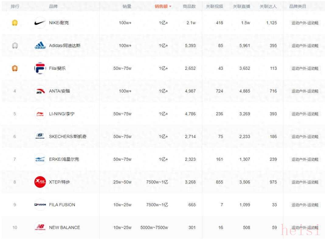 截至我所知的信息,以下是根據(jù)抖音平臺2024年6月份的數(shù)據(jù),整理出的男、女、童鞋類運動鞋熱門品牌榜TOP10: