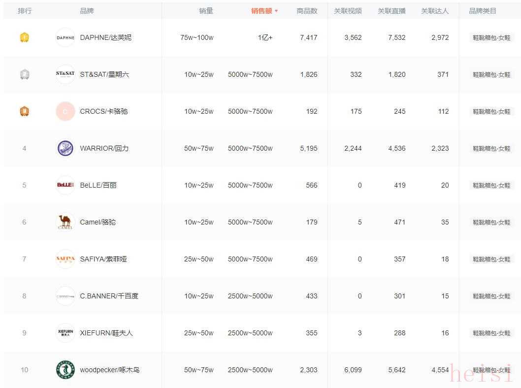 2024年6月抖音女鞋熱門品牌榜中,榜一榜二繼續(xù)被達芙妮和星期六占據(jù),但跟上月相比,銷量均有所下滑,達芙妮銷量75w~100w(上月100w+),銷售額1億+;星期六銷量10w~25w(上月25w~50w),銷售額5000w~7500w(上月1億+)。