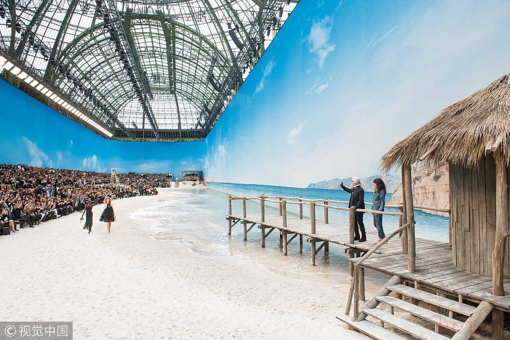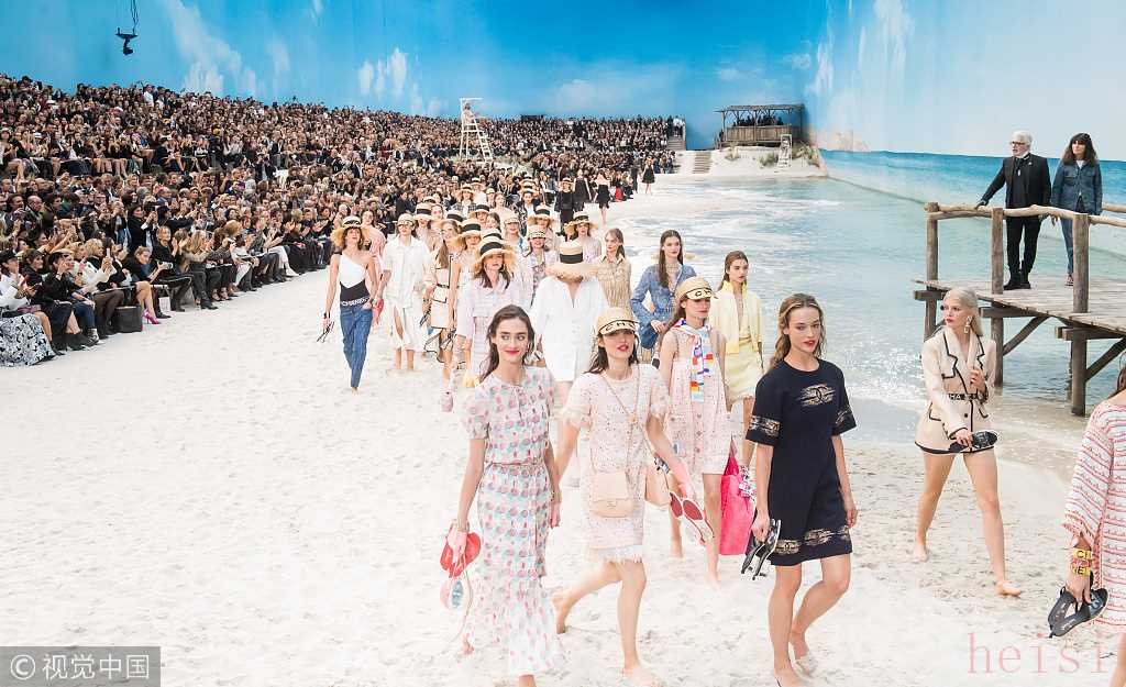 2019春夏系列還把巴黎大皇宮變成了度假海灘,極為真實的海浪陣陣拍打在沙灘上,模特則光著腳、提著高跟鞋從觀眾面前走過。
