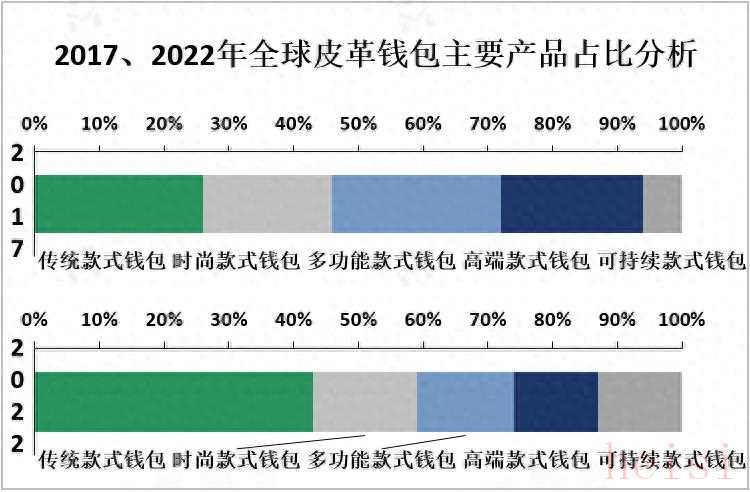 2017、2022年全球皮革錢包主要產(chǎn)品占比分析