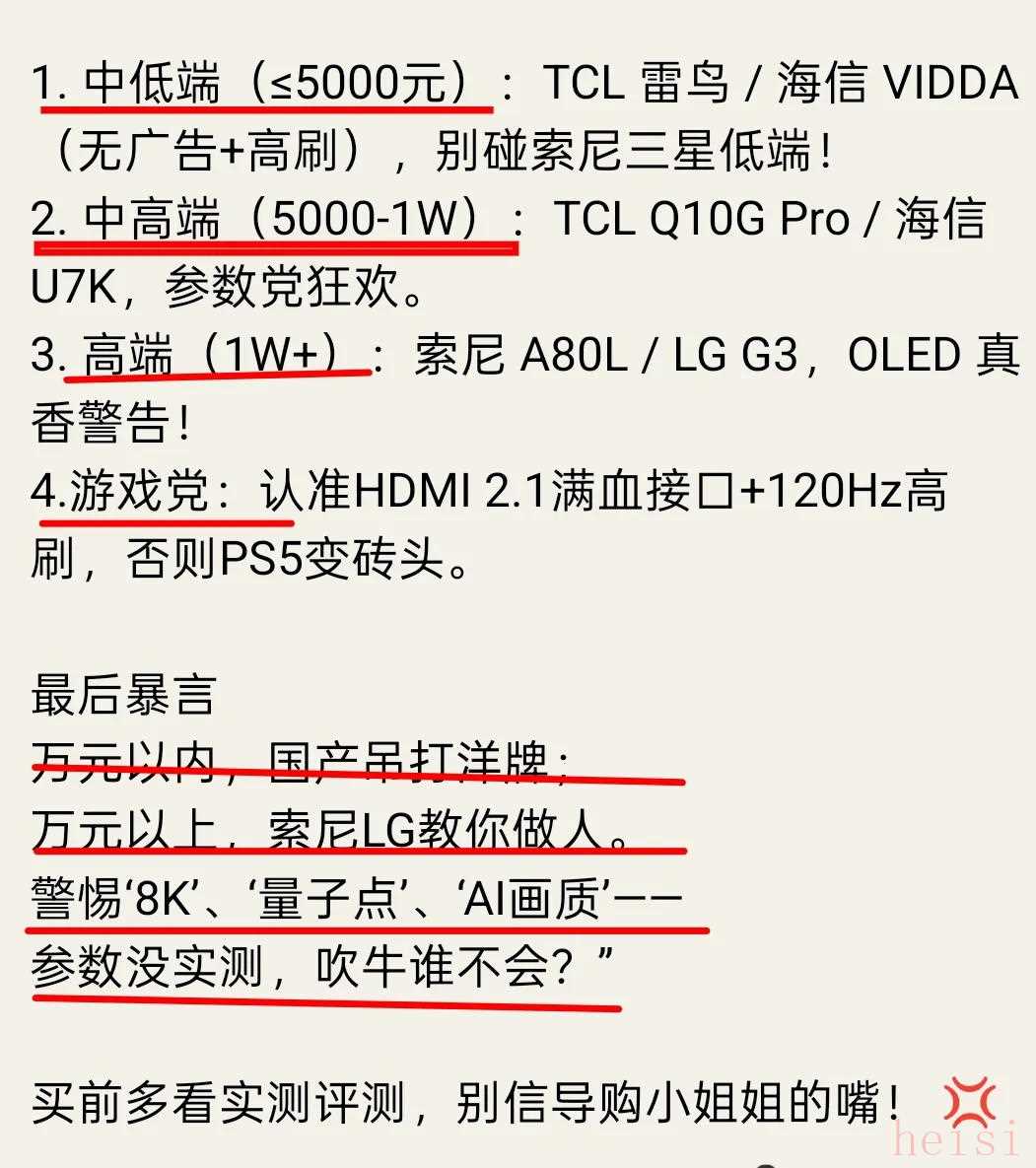 電視界?索尼貴婦穩(wěn)坐神壇,畫(huà)質(zhì)是真愛(ài),錢(qián)包是祭品;三星“機(jī)皇”花活多,參數(shù)黨智商稅交得歡;小米系工科男,性價(jià)比能打,高端夢(mèng)還在路上;某些國(guó)產(chǎn)“高端新貴”,韭菜刀磨得比屏幕還亮。記住:錢(qián)包比信仰重要,別為“概念”上頭,中端機(jī)夠香,舊款更實(shí)惠,參數(shù)吹上天不如眼睛驗(yàn)貨實(shí)在!韭菜,請(qǐng)自覺(jué)繞行鍍金鐮刀區(qū)。