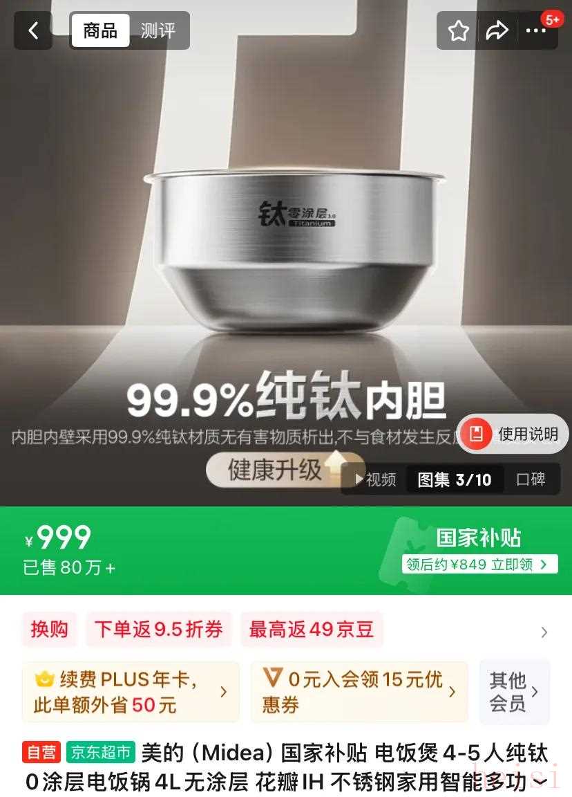 圖源:天貓 蘇泊爾官方旗艦店美的2023年推出的純鈦內(nèi)膽電飯煲,宣稱“99.9%純鈦,0涂層”,主打健康防粘。在京東已售出超50萬臺。