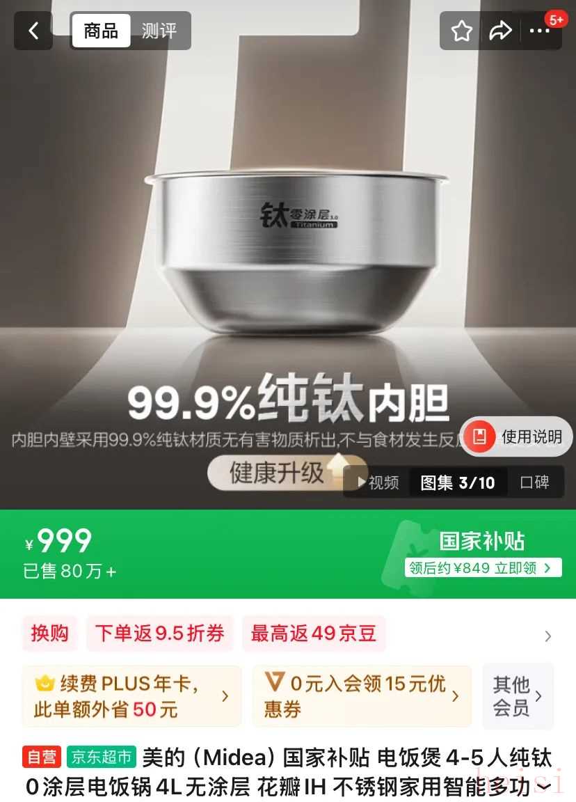 圖源:淘寶 富光旗艦店被制成鍋具時,鈦鍋也有“不糊不是真鈦鍋”的說法?!短熵埣揖?024鈦質餐廚器具趨勢白皮書》也顯示,“粘鍋”的使用體驗受到不少消費者吐槽。在價格上,“鈦”產品貴也是消費者關注的重點。尤其是同樣都是鈦產品,品牌之間存在價格差異。如在熱門鈦杯品牌中,小米和富光的熱銷款鈦保溫杯價格在200元左右,TAIC、飛劍熱銷款鈦保溫杯在1000元以上。鈦電飯煲也類似。在京東鈦內膽電飯煲熱賣榜,美的、蘇泊爾等品牌價格多在900元以上,榮事達等品牌的價格約為500元。圖源:京東 App對于價格差異,美的對有意思報告表示:“主要是材料等級差異、制造技術壁壘、品牌溢價因素等。美的鈦鍋采用高成本復合結構鍋,與食物接觸面能達到99.9%的純鈦,與其他品牌宣傳的‘有鈦’表面僅有少量鈦不同?!?/span>美的花瓣IH壓力電飯煲G5 圖源:品牌官方Snow Peak也表示:“鈦金屬本身價格較高,不同純度和等級的成本差異也較大。如Snow Peak鈦杯是由一整塊鈦板壓延加工成形的,這使得其厚度和純度更均勻。而且鈦金屬硬度高,常規(guī)壓延易變形、斷裂、破損,在生產過程中,需要手工匠人憑經驗和直覺對著壓力機不斷微調,多次反復試制,制作成本高?!?/span>對于未來“鈦”材料能否成為杯具、廚具的主流,業(yè)內普遍認為還有很長的一段路要走。首先是價格。目前鈦材質產品明顯高于同類產品的價格勸退不少消費者。以電飯煲為例,在京東電飯煲熱賣榜中,總榜銷量前30名中,僅有一款美的鈦內膽電飯煲,售價近1300元,其余均是不銹鋼等傳統(tǒng)材質內膽,價格多為幾十元到百元,最貴不超過500元。就品牌來看,目前鈦制品僅在戶外領域存在如Snow Peak這樣的頭部品牌,在其他保溫杯、水杯、廚電等領域,多作為品牌的一條產品線。對于為什么鈦制品難跑出頭部品牌,業(yè)內認為跟其功能的可替代性有關。張毅指出:“技術迭代雖可能補足鈦制品的短板,但替代材料也可能同步滿足消費者需求。因此,鈦杯、鈦鍋短期內難成主流?!?/span>但至少,鈦制品可以被看作是一個新的選擇?!半m然它不一定能取代不銹鋼材質,但注重健康和時尚的人群會喜歡?!眹崌岯OTTLED JOY表示。頭圖來源:左為天貓飛劍旗艦店,右為蘇泊爾官方旗艦店