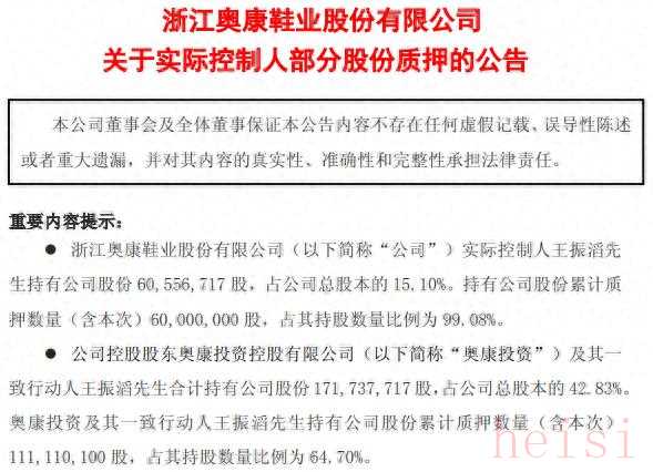 公告顯示,控股股東奧康投資及其一致行動人王振滔合計持有公司股份1.72億股,占公司總股本的42.83%,算上本次質(zhì)押,累計質(zhì)押數(shù)量為1.37億股,占公司總股本的34.19%。