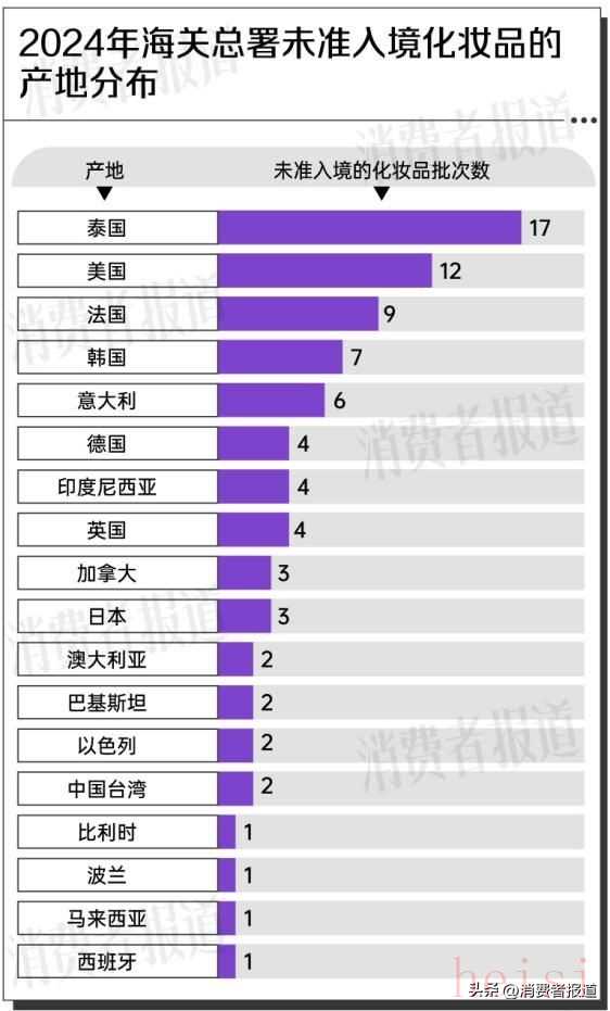 從產(chǎn)地看,2024年被拒入境的化妝品產(chǎn)地分布在18個國家和地區(qū)。其中,泰國、美國、法國是去年未準(zhǔn)入境化妝品的三大來源國,未準(zhǔn)入境產(chǎn)品分別有17批次、12批次和9批次。