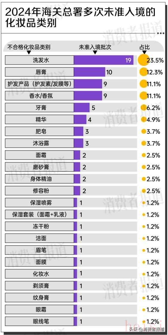 經(jīng)《消費(fèi)者報(bào)道》梳理,2024年度被拒入境的化妝品涵蓋了面部護(hù)膚、洗發(fā)護(hù)發(fā)、口腔護(hù)理、身體護(hù)理、香水彩妝等多個細(xì)分領(lǐng)域。