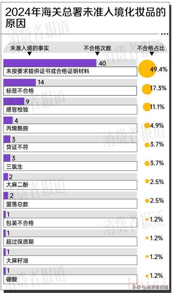 在進(jìn)口被拒的化妝品中,未按要求提供證書或合格證明材料的化妝品達(dá)40批次,占不合格比例的49.4%,是化妝品入境受阻的最主要因素。此外,產(chǎn)品標(biāo)簽不規(guī)范、感官檢驗(yàn)不合格等問題同樣屢見不鮮,是導(dǎo)致化妝品無法順利通關(guān)的常見障礙。