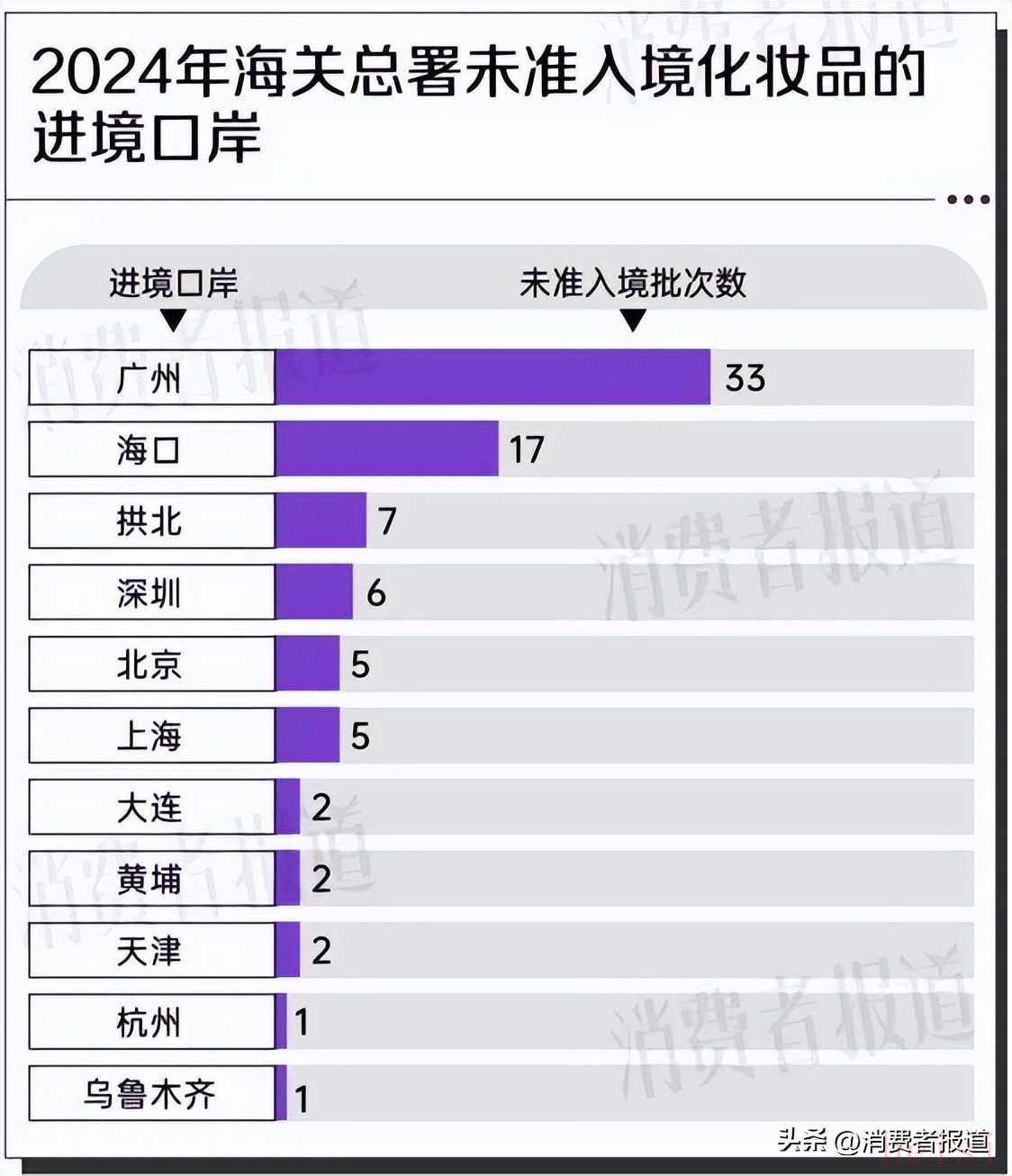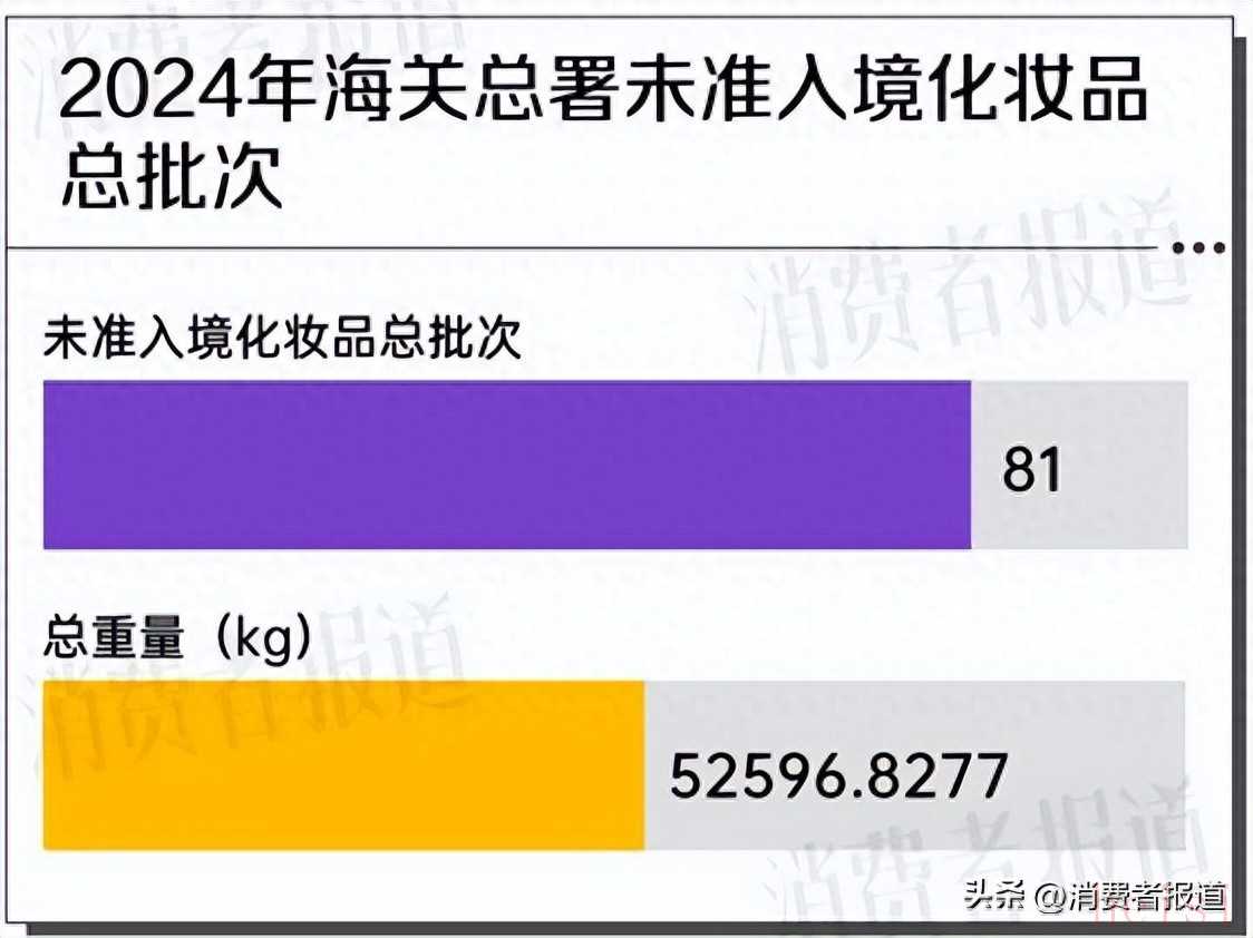 經(jīng)《消費(fèi)者報(bào)道》統(tǒng)計(jì),2024年,海關(guān)總署通報(bào)了全國未準(zhǔn)入境的化妝品共81批次,總重量約52597kg,相當(dāng)于一個普通女性3000年的使用量。