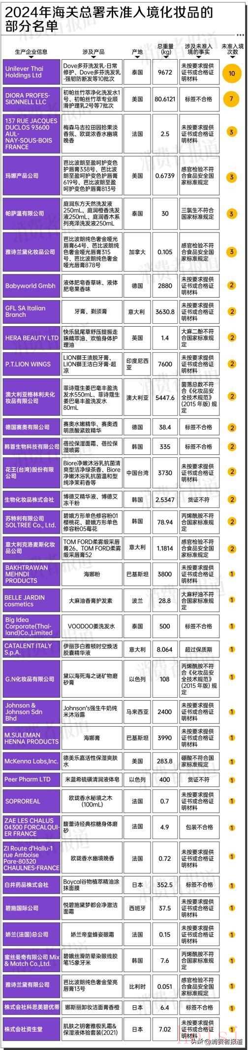 近日,《消費(fèi)者報(bào)道》梳理了中華人民共和國海關(guān)總署(下稱“海關(guān)總署”)自2024年1月至2024年12月公布的全國未準(zhǔn)入境化妝品信息,并進(jìn)行整理分析,發(fā)現(xiàn)在這份“黑名單”中,不乏消費(fèi)者耳熟能詳?shù)膰H知名品牌。