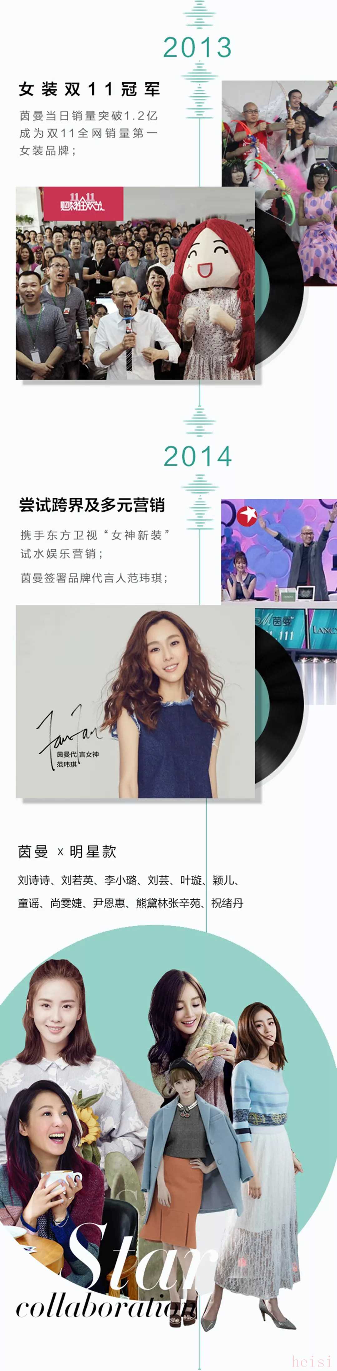 第一次將品牌定位“棉麻藝術(shù)家”亮相于眾,以棉麻為主打讓消費(fèi)者留下清晰的品牌印記;第一次單日銷(xiāo)售額突破1.26億元,成為雙11全國(guó)女裝銷(xiāo)售冠軍;第一次嘗試娛樂(lè)化營(yíng)銷(xiāo),攜手《女神的新衣》,成為大眾認(rèn)知的品牌。。。