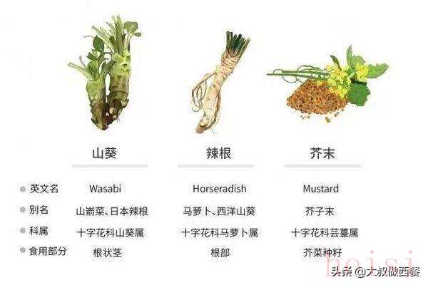 - "特點(diǎn)":辣味芥末的辣味較黃芥末更辣,但甜味可以平衡辣味,口感較為柔和。