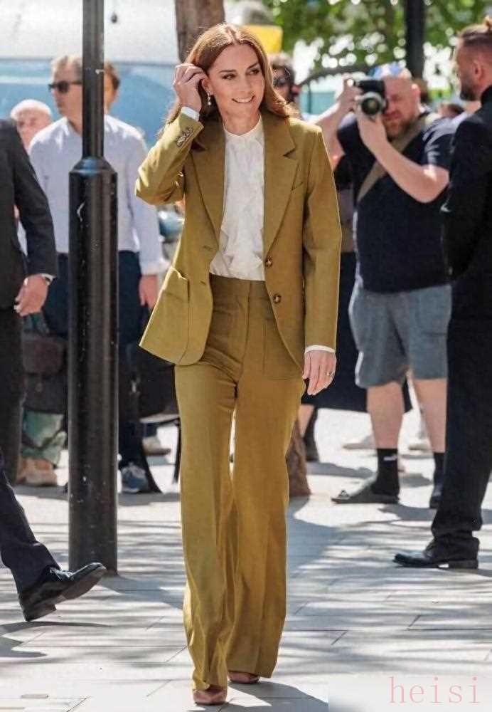 凱特王妃的造型總能精準(zhǔn)拿捏“職業(yè)感”與“時尚度”的平衡。橄欖綠西裝套裝剪裁利落,喇叭褲設(shè)計(jì)既有70年代復(fù)古韻味又自帶現(xiàn)代商務(wù)氣場,搭配白色飄帶襯衫瞬間提亮整體,職場女性完全能照搬這套公式。她對英國本土設(shè)計(jì)師的支持不僅體現(xiàn)在服裝上,連珠寶也藏著巧思——月光石耳環(huán)象征女性能量,巴林珍珠耳墜致敬王室傳承,細(xì)節(jié)里都是高級感。