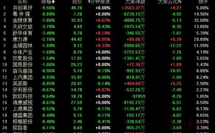 不過今日金陵體育、共創(chuàng)草坪、舒華體育等概念股均出現大幅回調,資金撤回跡象明顯,其中共創(chuàng)草坪下跌9.56%,金陵體育跌超7.56%。