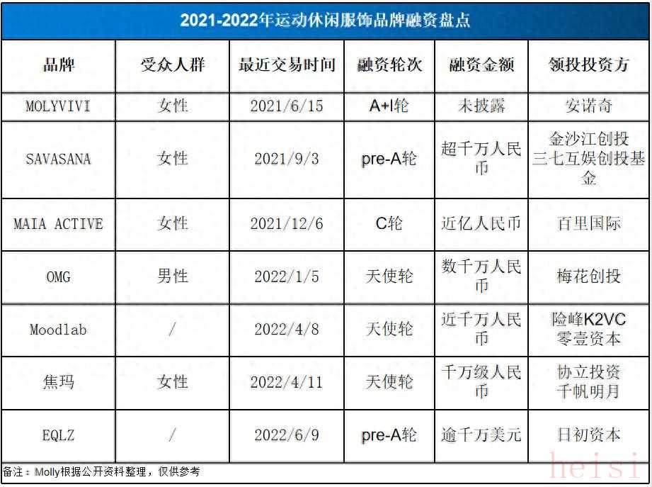 運(yùn)動(dòng)服飾類目仍是近年來資本看重的賽道之一,自2021年-2022年上半年,已經(jīng)完成了多起融資事件,融資金額超億元。Molly盤點(diǎn)了近一年內(nèi)發(fā)起的融資事件。