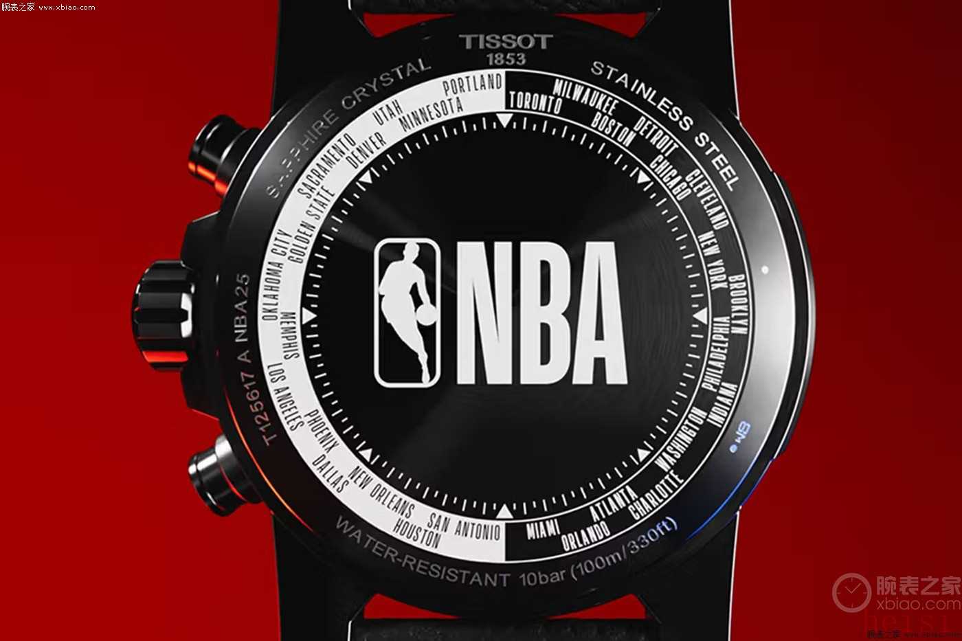 黑色紋理表帶采用橡膠、合成材料和皮革制成,與表盤的質(zhì)感相得益彰,非常適合日常佩戴和體育活動。表帶飾有紅色和藍(lán)色線條,再次呼應(yīng)NBA的標(biāo)志性顏色。表背精心雕刻N(yùn)BA徽標(biāo),四周環(huán)繞球隊(duì)名稱和所在城市,西部和東部聯(lián)盟均按緯度排列。