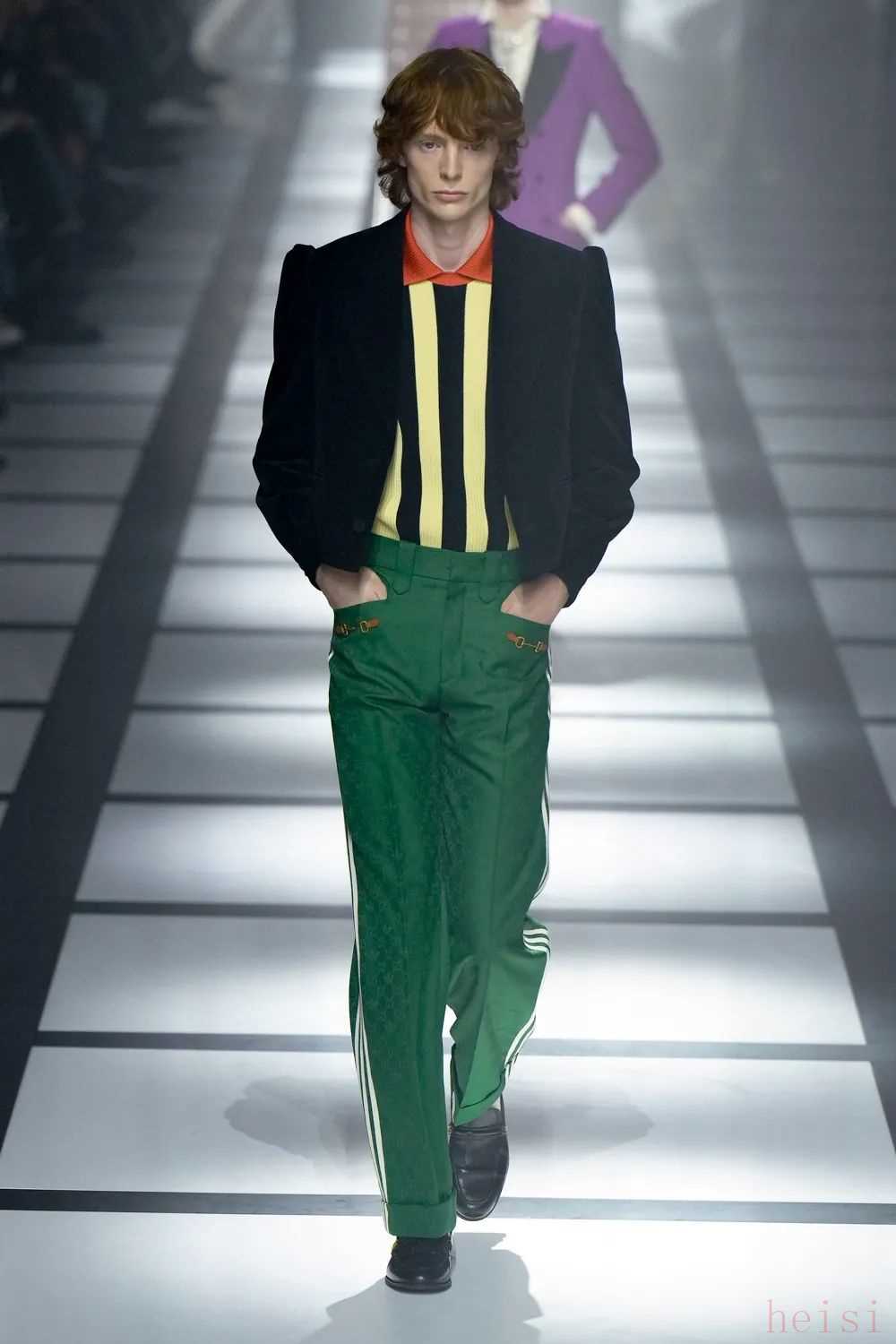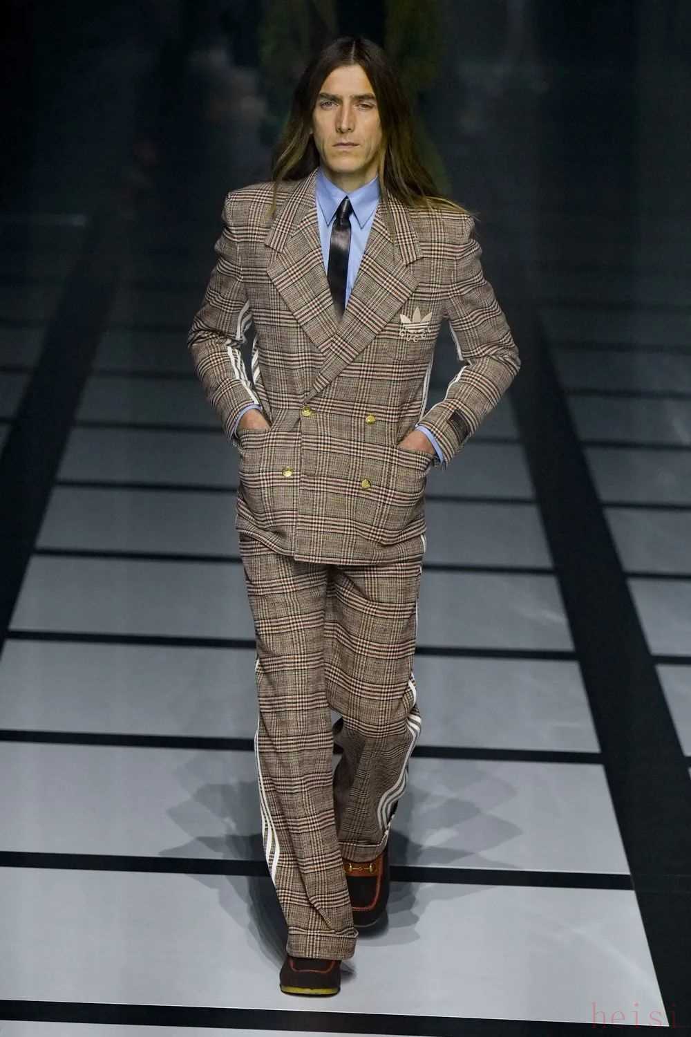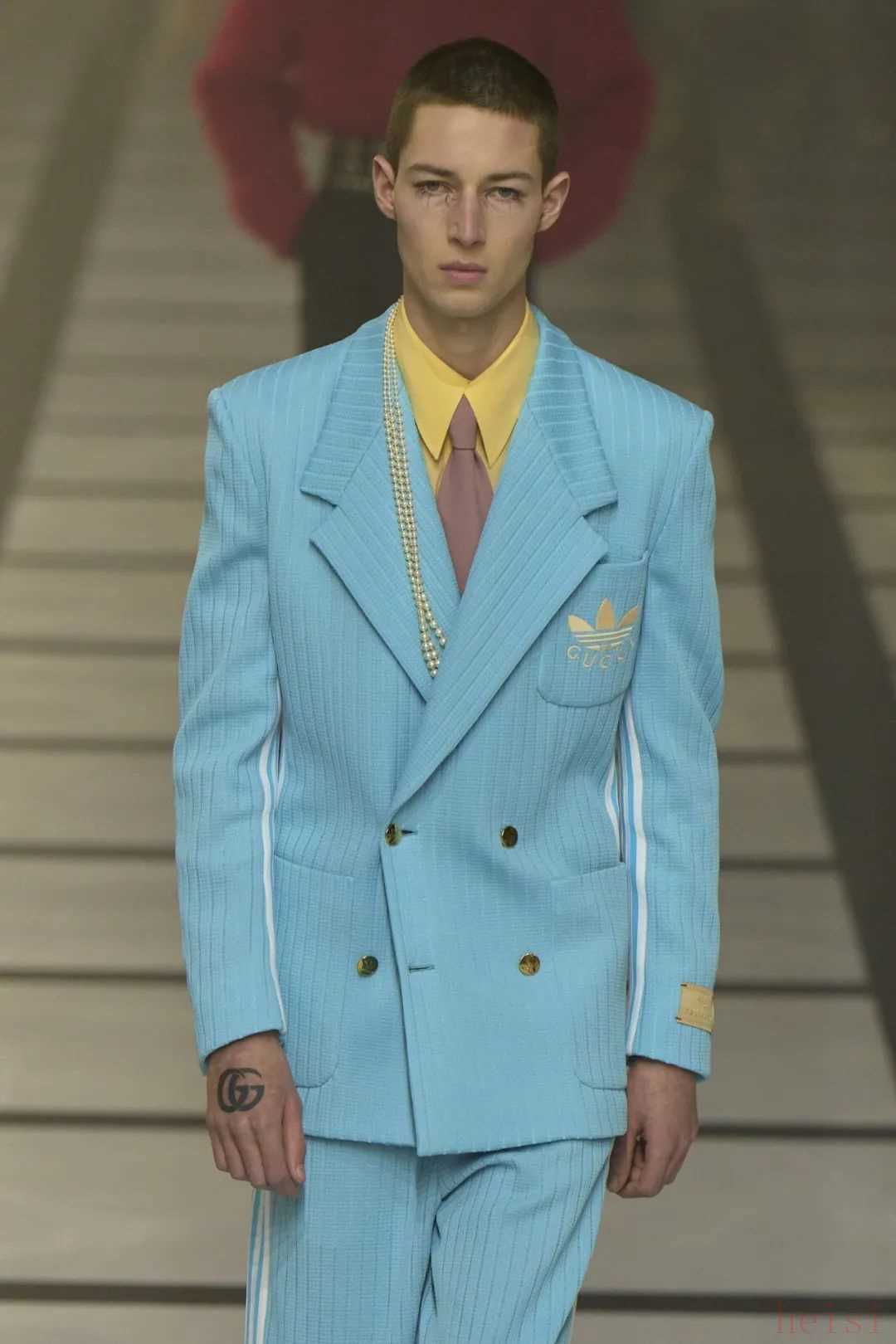 西服套裝將阿迪達(dá)斯經(jīng)典三線元素與三葉草標(biāo)志及GUCCI標(biāo)識融入設(shè)計。