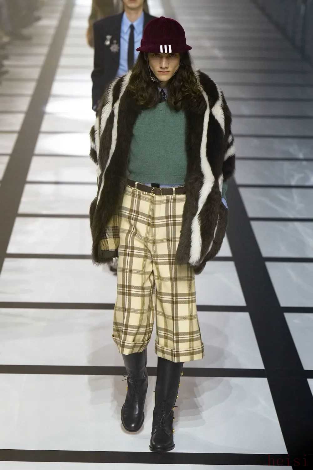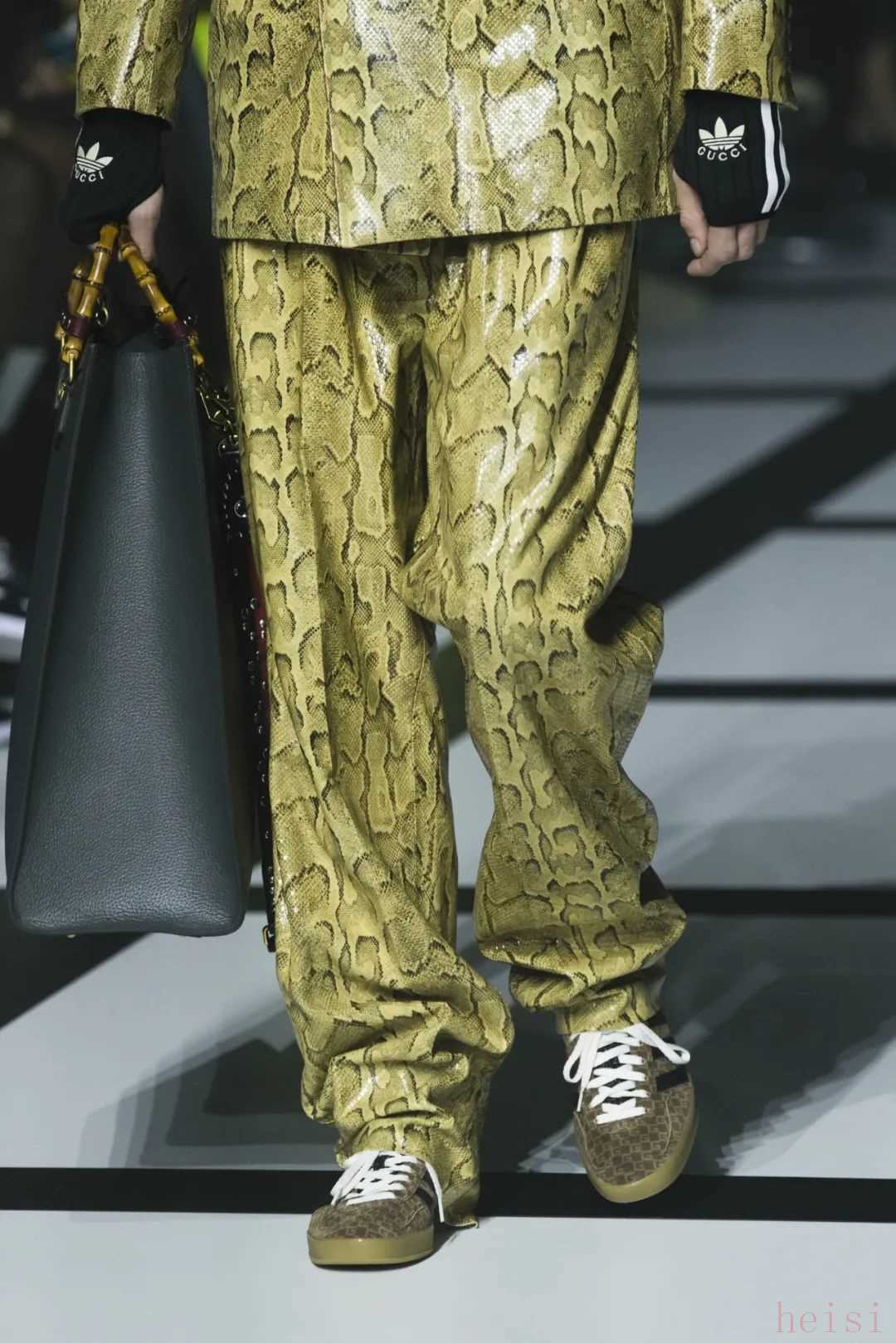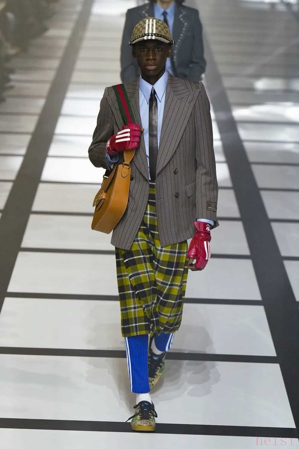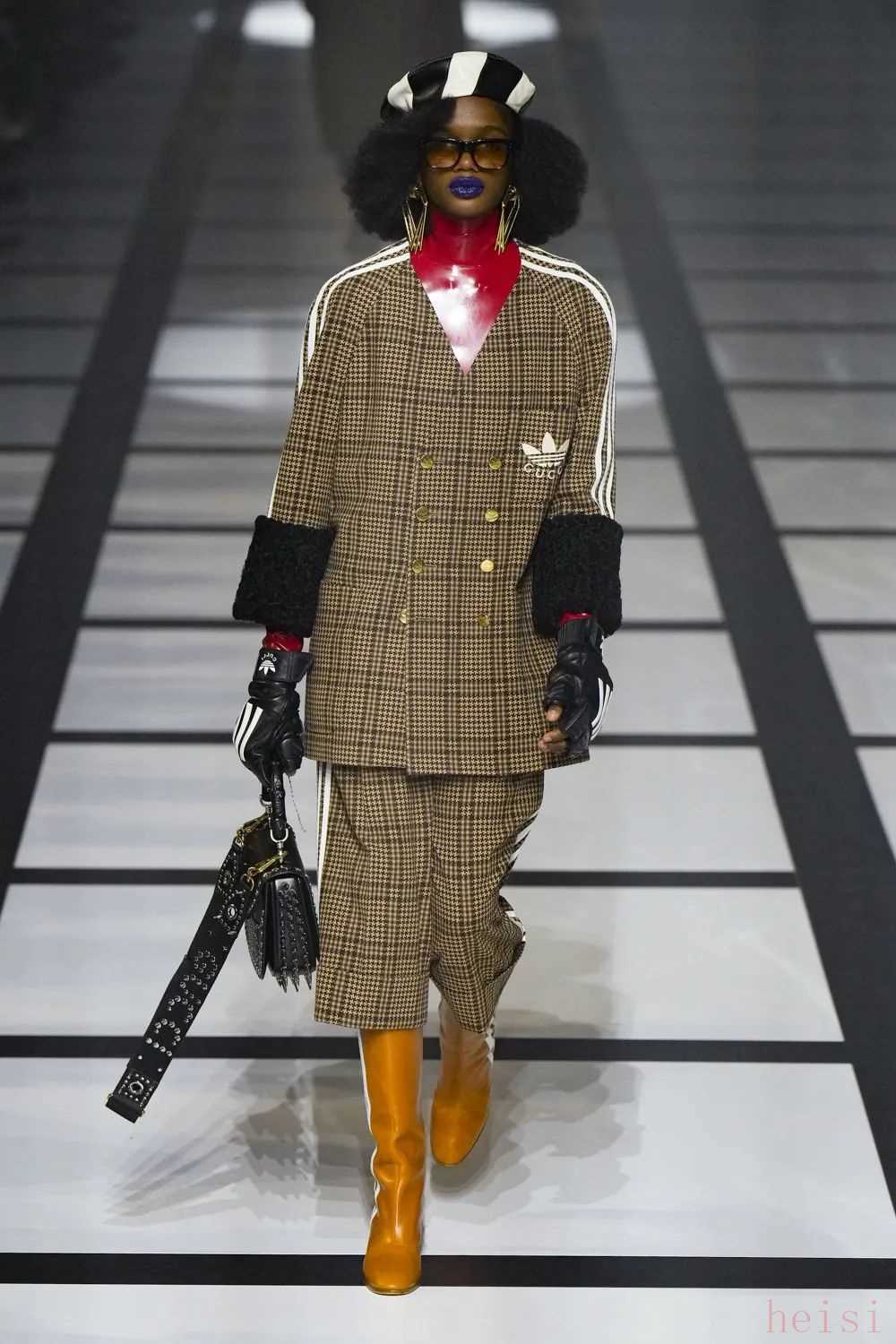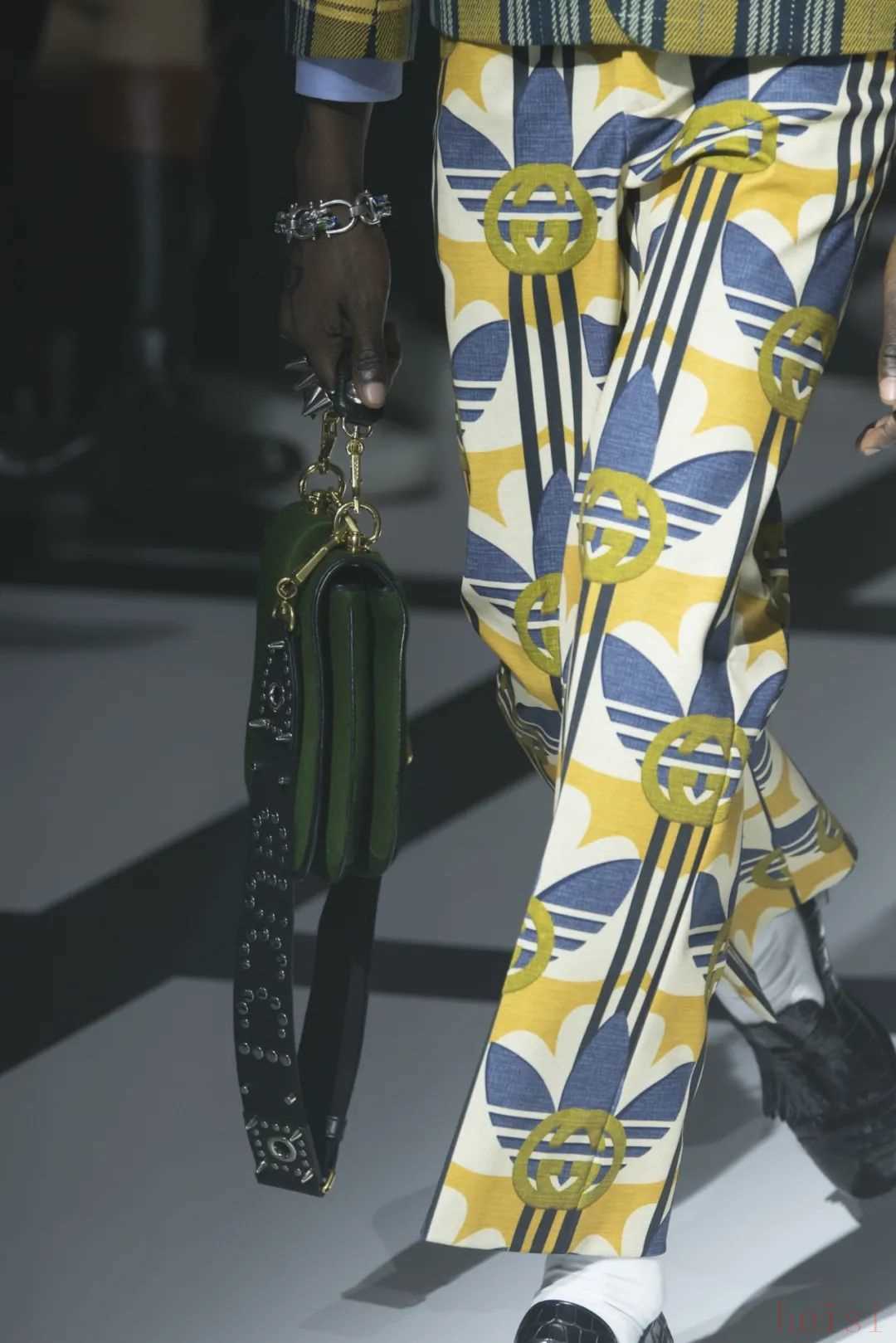 本次大秀中,與阿迪達(dá)斯三葉草的聯(lián)名系列成為最大、最有話題的驚喜亮點(diǎn)之一。聯(lián)名產(chǎn)品里,鑲鉆亮片外套疊加皮褲,格紋元素的使用再上新高度,體現(xiàn)了GUCCI一如既往的張揚(yáng)與華麗。
