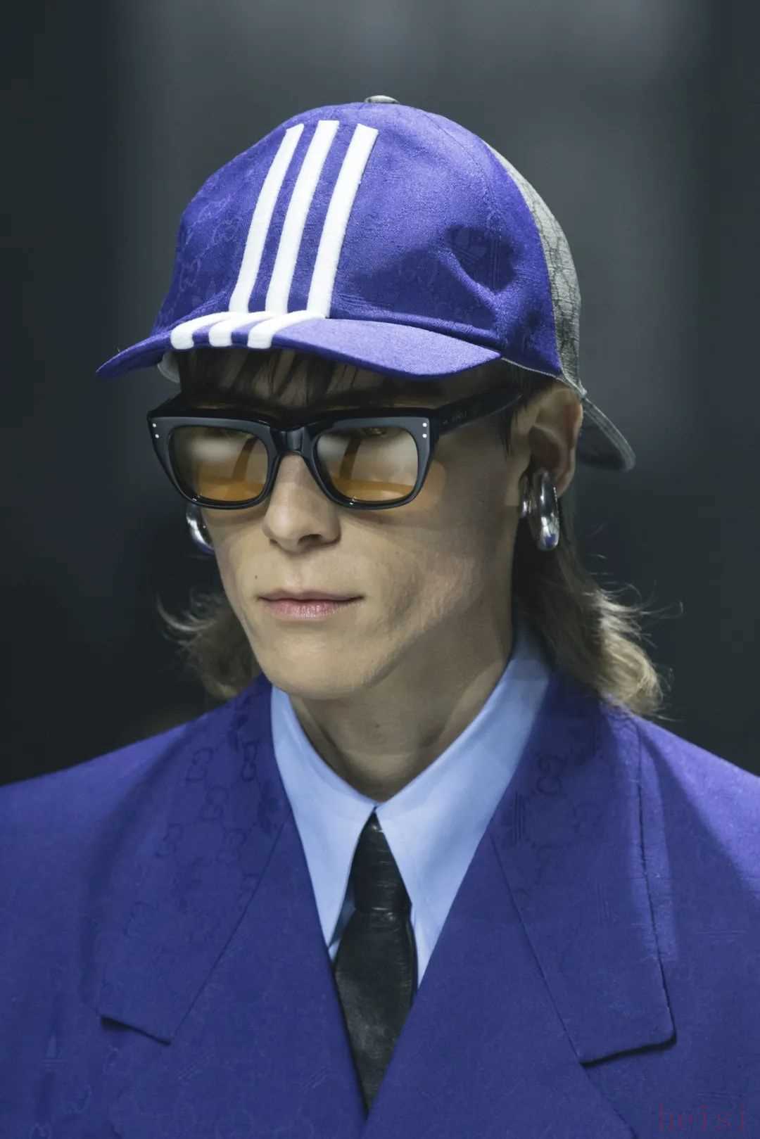 顏色鮮明的漁夫帽與棒球帽亦是聯(lián)名系列中的配飾精華,還有GUCCI秀場常見的馬球帽、線帽,結(jié)合了三線標(biāo)識之后,也釋放出活力的運(yùn)動氣息。