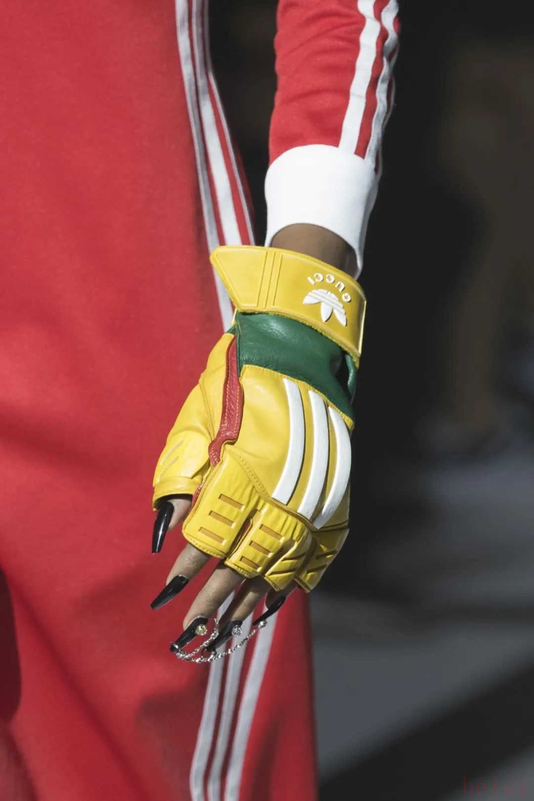 除此之外,配飾方面也相當(dāng)出彩,每件都有爆款潛質(zhì)。就像這副黃色運(yùn)動手套,戰(zhàn)斗氣息與奢華感十足,非常搶眼。