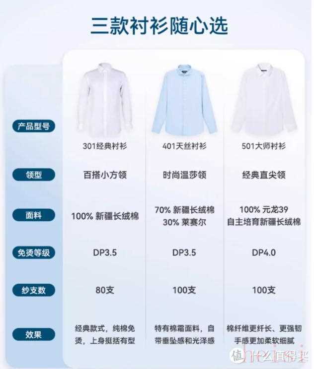 3.面料選擇:面料可分為純棉、桑蠶絲、棉麻和混紡材質(zhì),考慮到工作和通勤等場(chǎng)合,以及性價(jià)比,還是建議選擇穿棉材質(zhì),透氣性好,吸汗性強(qiáng),選擇高支數(shù)的純棉面料,穿著更舒適,且不易起皺。