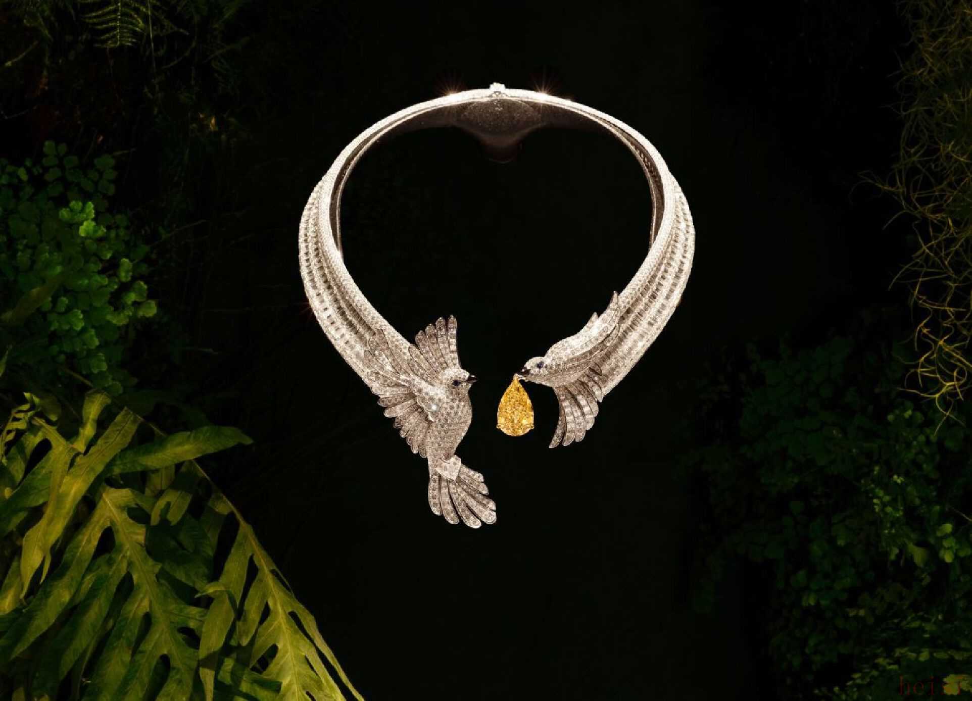 英國(guó)高級(jí)珠寶品牌GRAFF格拉夫最近在巴黎高定時(shí)裝周上發(fā)布了一個(gè)瑰麗不凡的高級(jí)珠寶新作:一條黃鉆雀鳥(niǎo)鉆石項(xiàng)鏈,共鑲嵌了一顆13.51克拉梨形濃彩黃鉆,以及其他2247顆梨形、圓形和梯形切割白鉆,鉆石總重高達(dá)125克拉。