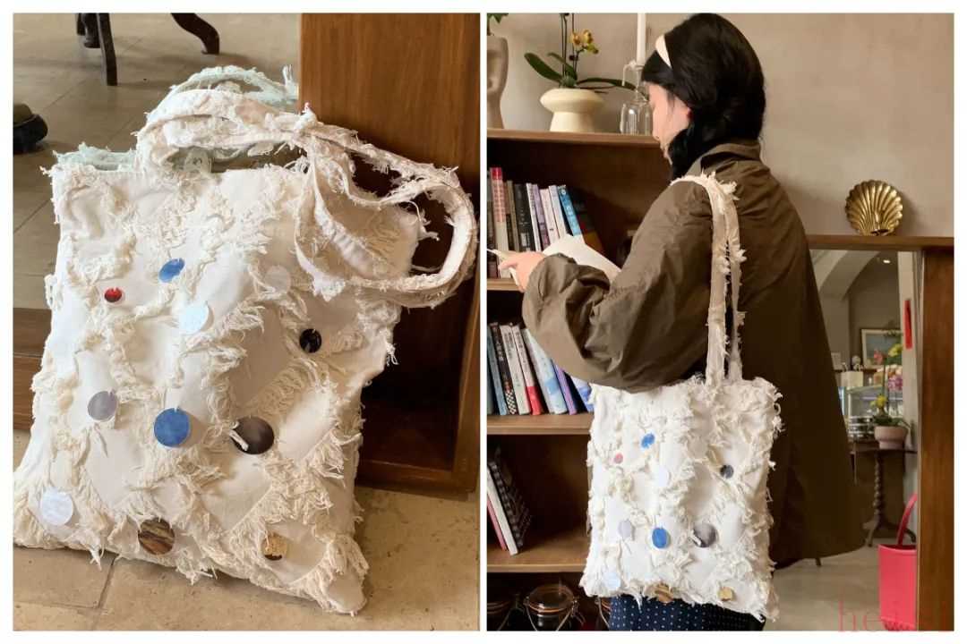 刻意規(guī)避了硬挺的版型保存慵懶和松弛感,加厚的帆布面料保留了充滿設(shè)計(jì)感的天然棉花殼小黑點(diǎn)點(diǎn),厚實(shí)的肩帶更舒適。