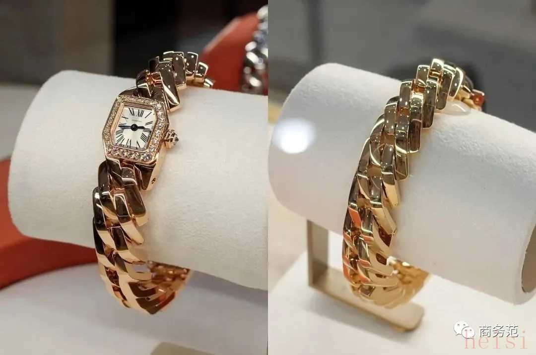 今年新表還有Maillon De Cartier,也是一款典型的珠寶腕表,以手鐲為設計靈感,表盤非常小巧,幾何線條表鏈是它的一大特點。表鏈雖然看起來硬朗,但實際每一節(jié)都是可以活動的,佩戴起來非常柔和靈動,完美貼合手腕曲線,既是手表又是手鏈~