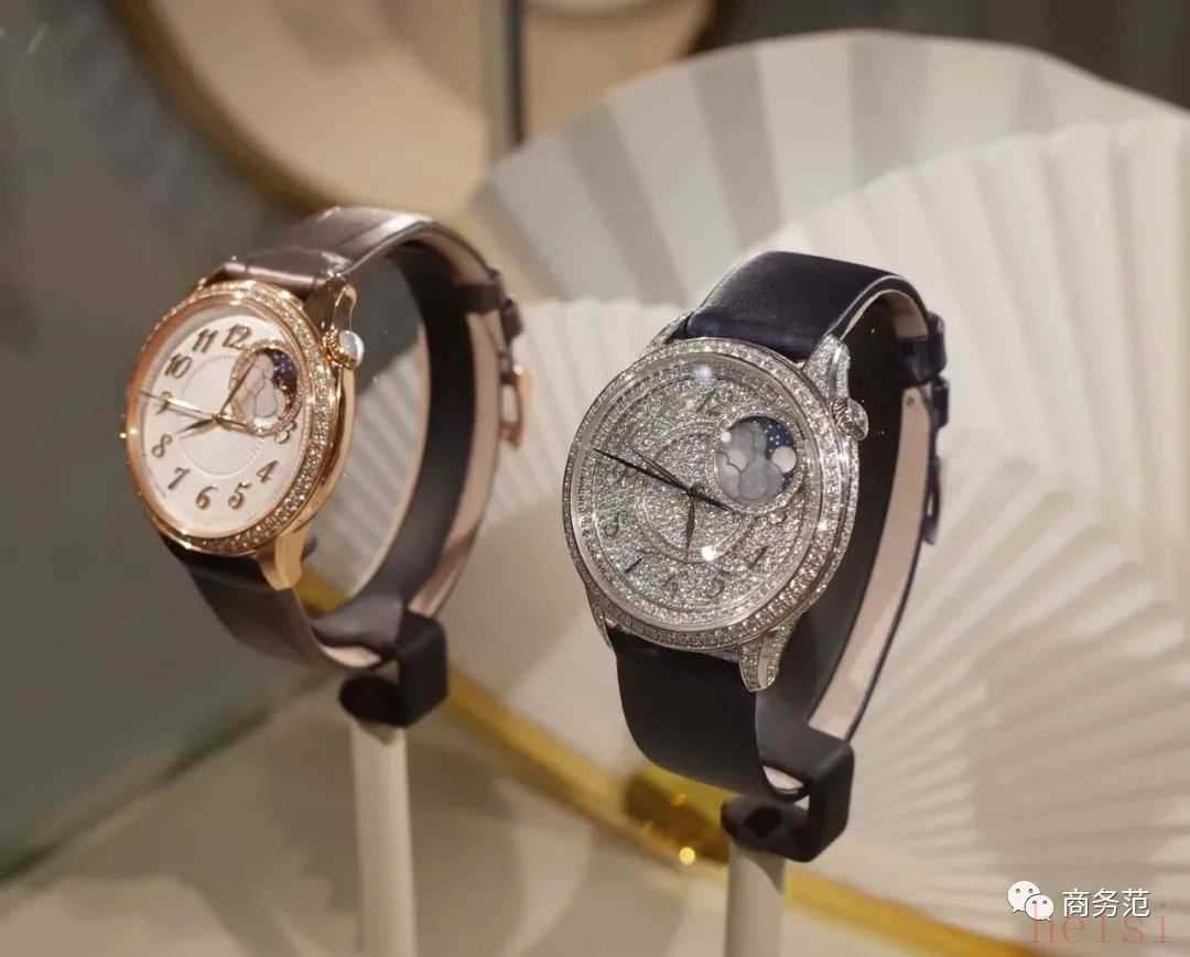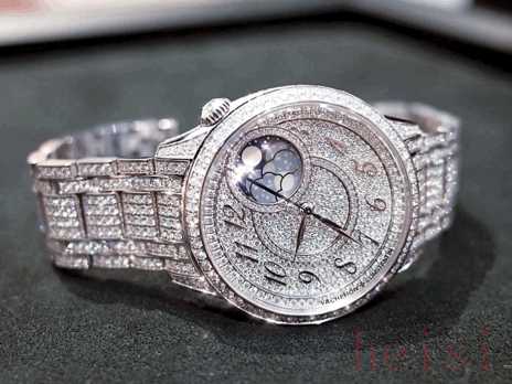 這個系列還有滿天星款,范主看到它,就再也無法把目光移開~從表盤、表圈到表帶全都是密鑲鉆石,總重12克拉,月相小表盤的云朵是藍寶石水晶,月亮是貝母材質(zhì),表冠鑲嵌鉆石,女神氣質(zhì)100%~