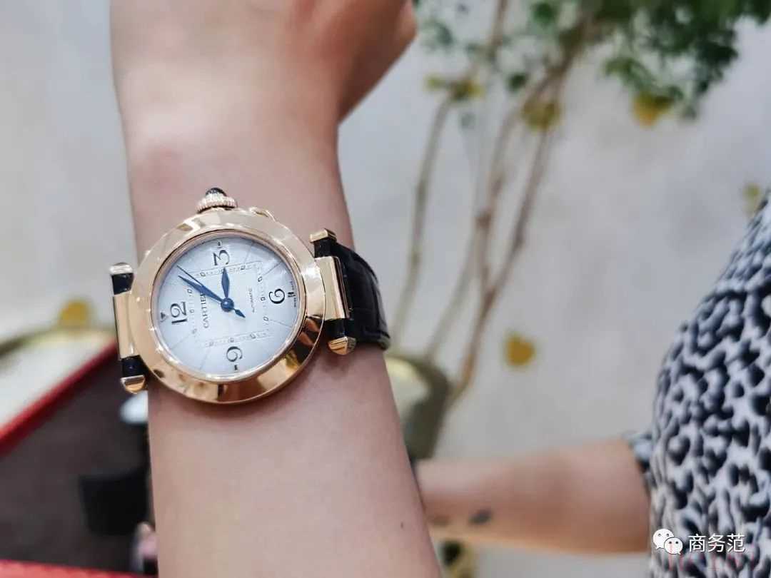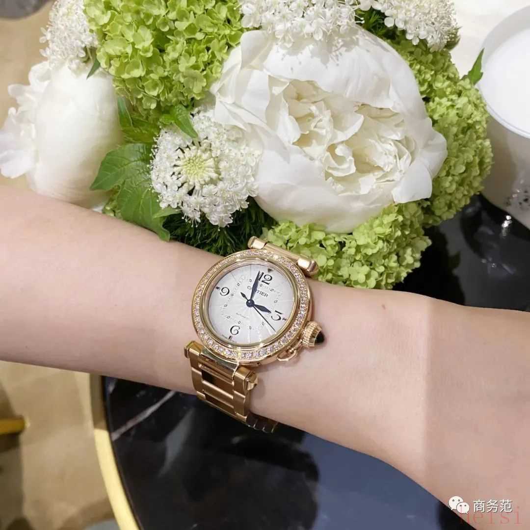 玫瑰金鑲鉆的款式女人味十足,上手既優(yōu)雅又富有力量感,金表很顯貴氣。防水深度100米也很實用,價格292000。