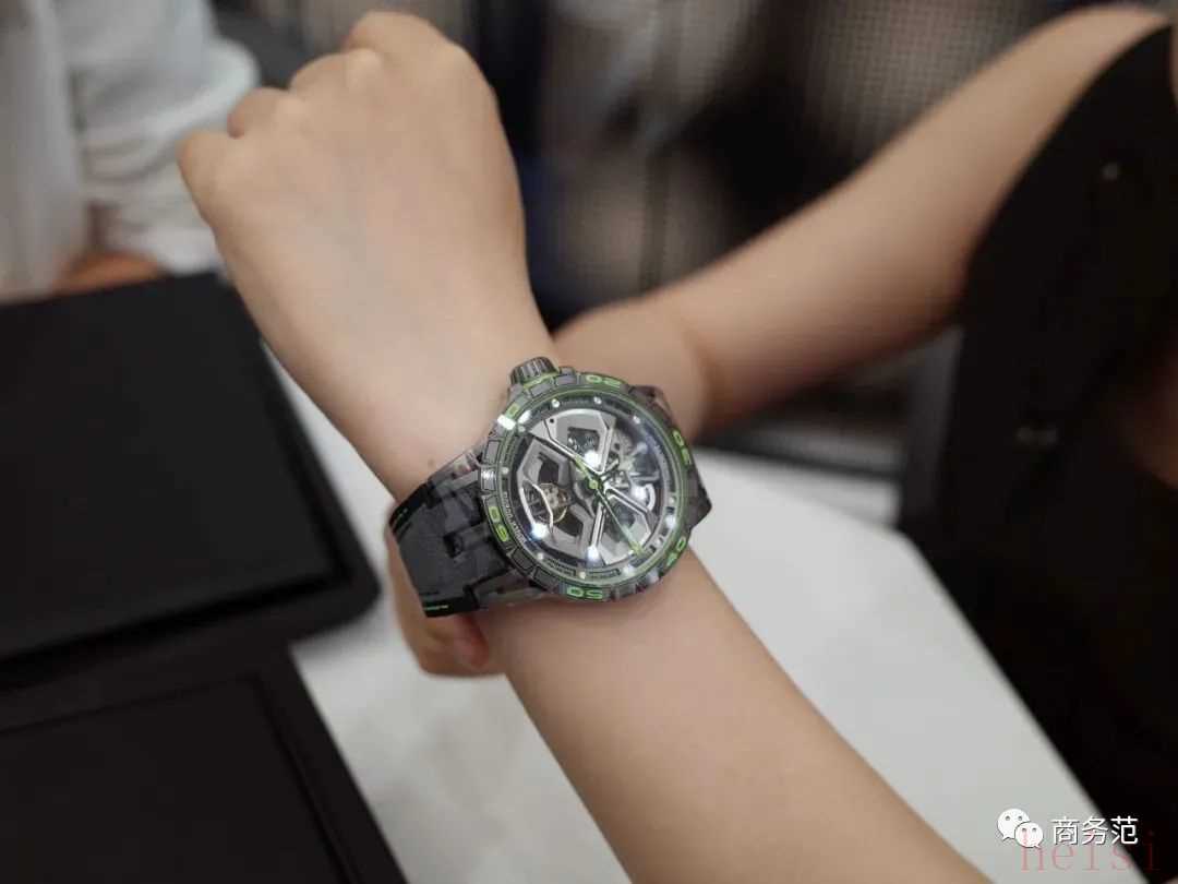 還有羅杰杜彼的Excalibur Huracán Performante腕表,靈感來自蘭博基尼超跑,采用DLC鈦合金涂層,表圈、指針、表冠和表帶縫線等細節(jié)增加裝飾元素,科技感和時尚度爆棚。