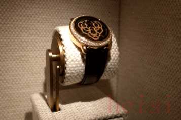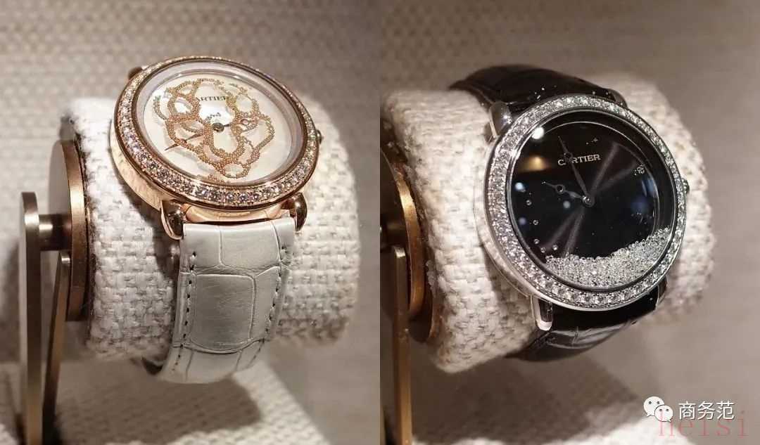 這款“流金歲月”也來自獵豹高級珠寶腕表系列,表殼內(nèi)裝有一種特殊液體,許多小金珠漂浮其中,當腕表變換角度轉(zhuǎn)動時,金珠會流動組合成一個豹子頭的形狀,再晃動腕表時,豹子頭又會“消失”。設計充滿奇思妙想,需要特別復雜的工藝,才能實現(xiàn)這一神奇效果。左邊的金珠款價格80萬,右邊是鉆石款,共有650顆明亮切割鉆石,價格100萬。