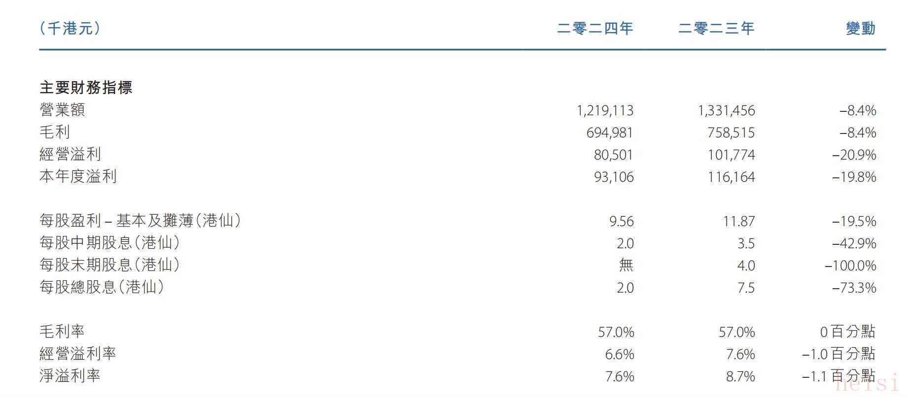 近年來,金利來集團業(yè)績遭受挑戰(zhàn)。2024年營業(yè)額12.19億港元,同比下跌8%,公司擁有人應(yīng)占溢利9309.7萬港元,下滑20%,其中服裝服飾的銷售同比下跌6% 。值得一提的是,盡管業(yè)績下滑,但金利來的財務(wù)狀況頗為穩(wěn)健,賬面資金充裕。財報顯示,截至2024年底,公司現(xiàn)金及銀行結(jié)余約為10.52億港元,且沒有任何銀行貸款及透支,資產(chǎn)負債比率為零。