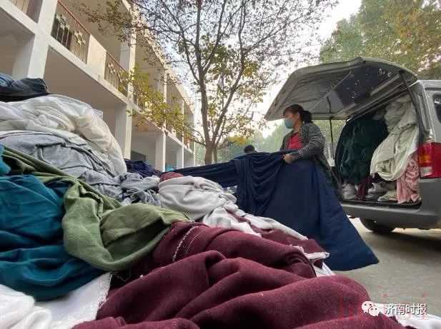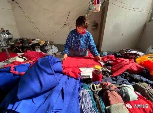 村民鄭秀娥從王運成那里買下兩噸布料,這些布料她需要用五菱宏光車廂搬運六次。她的家庭作坊,一天可以用掉一整車的布料。記者詢問是否可以去她家采訪,她搖了頭?!懊χ?。”她說著從地上拿起一卷布料,扔向車廂。其他的村民站在一旁起哄,“她怕露富!”