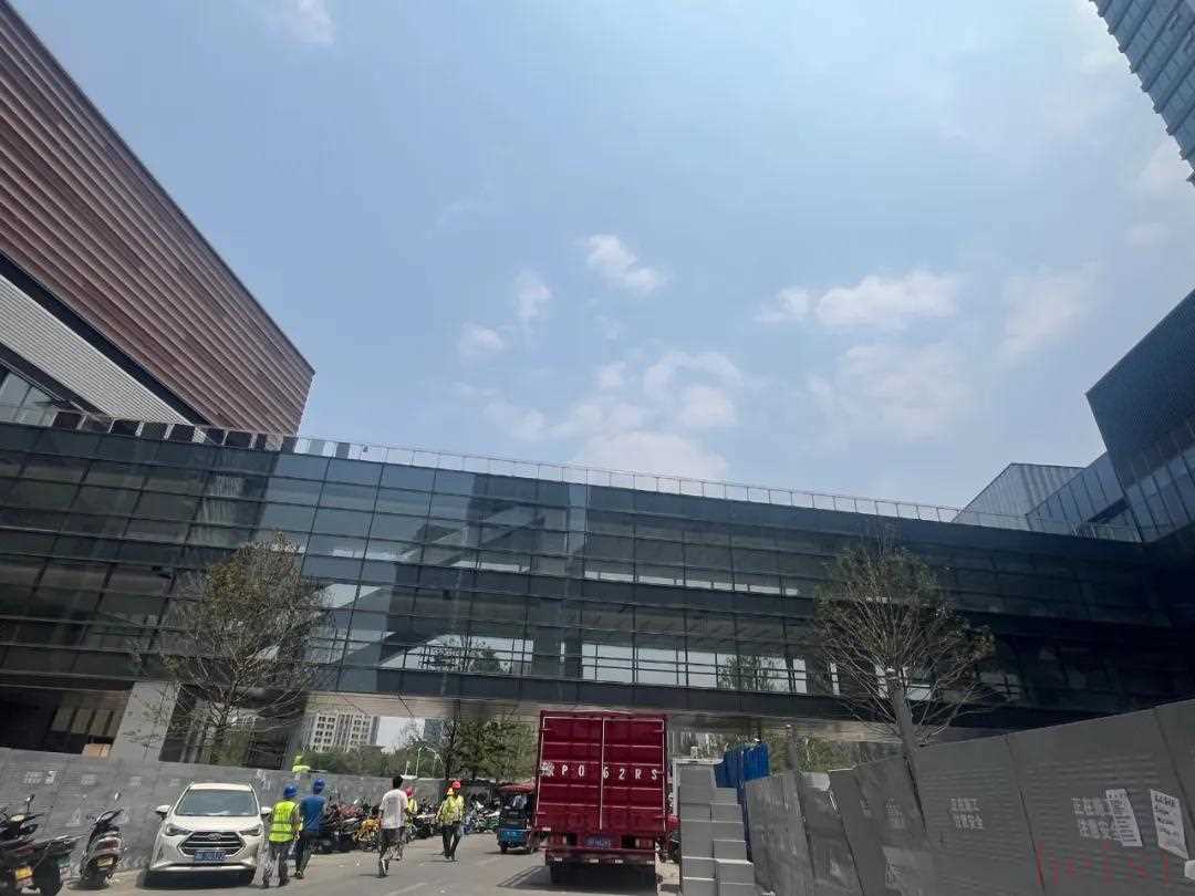 連接北區(qū)和南區(qū)、橫跨祥盛街的玻璃連廊已經(jīng)完工,也能看到施工工人在里面行走。