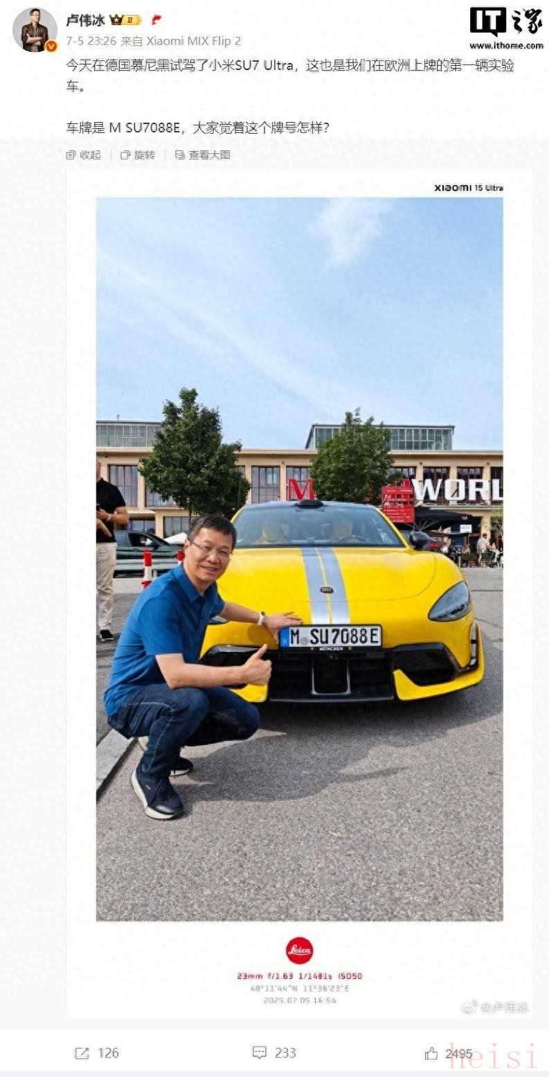 小米總裁盧偉冰德國(guó)試駕新車,網(wǎng)友卻盯著車牌眼饞!這事鬧的,普通車牌都比國(guó)內(nèi)綠牌順眼。盧偉冰7月5號(hào)發(fā)文說,在德國(guó)慕尼黑試駕了小米SU7 Ultra實(shí)驗(yàn)車,還拍了照炫耀。這車是小米在歐洲上牌第一輛,車牌號(hào)M SU7088E,開頭字母代表小米意思。底下評(píng)論最火的就是一句——國(guó)外車牌真好看,網(wǎng)友還加了狗頭表情。你就說吧,小小車牌戳中多少人心事。