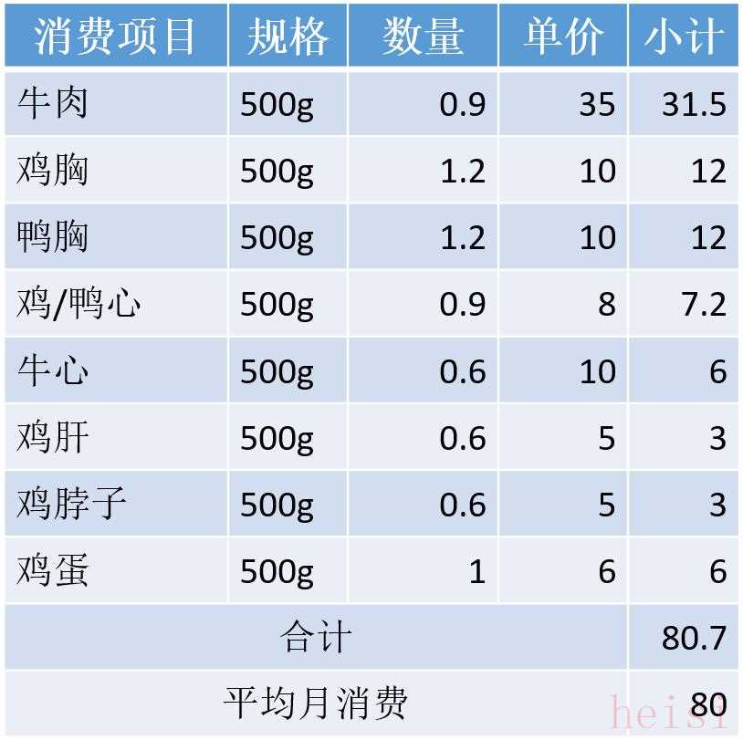 波波亞吃生骨肉期間的花銷比較復(fù)雜,因?yàn)橛幸恍┰囼?yàn)品,有一些送人的,還有一些我們自己吃了(沒錯(cuò),我們自己吃,因?yàn)橘I的都是人用食材),沒有辦法都算到波波亞身上,我就以波亞的喂食量(每天200g)為基礎(chǔ)來(lái)計(jì)算一個(gè)月所需要的分量,從而計(jì)算這段期間波波亞的食物花銷: