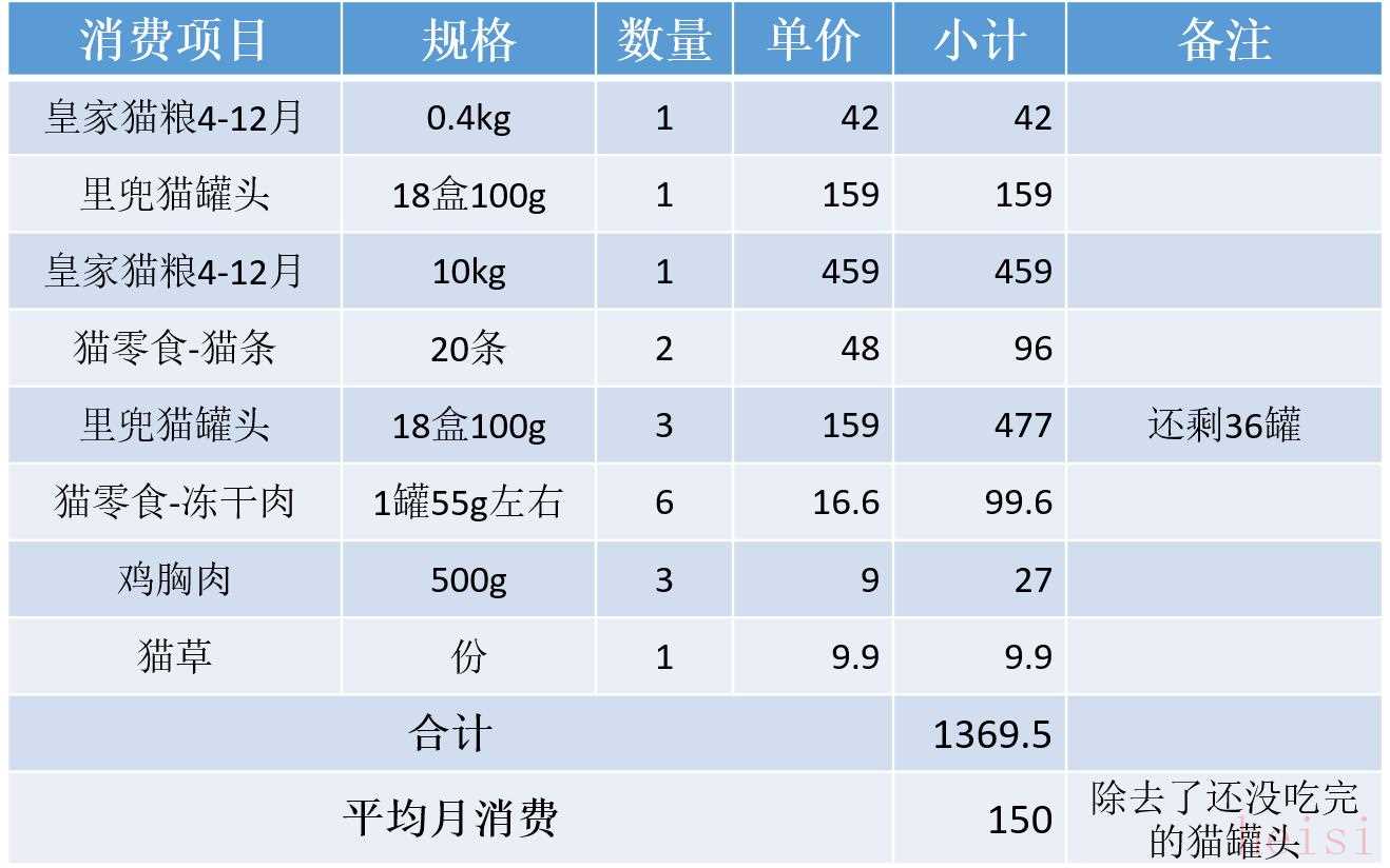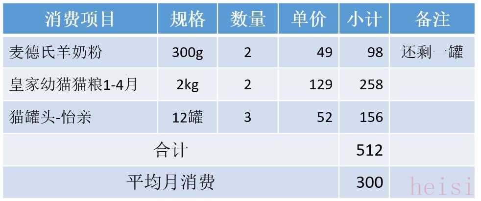波波亞作為幼貓時(shí)期(3個(gè)月之前)主要吃皇家貓奶糕、喝羊奶,偶爾也吃一點(diǎn)貓罐頭。但是貓?zhí)×?,一個(gè)罐頭一次吃不完,所以浪費(fèi)也還是挺多的。幼貓期間波波亞的飲食消費(fèi)情況如下: