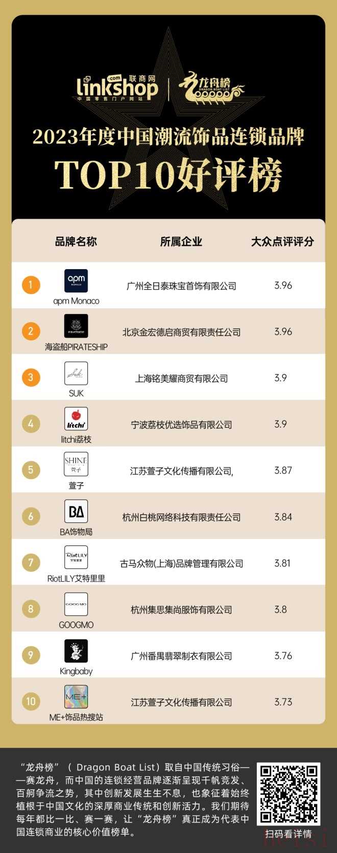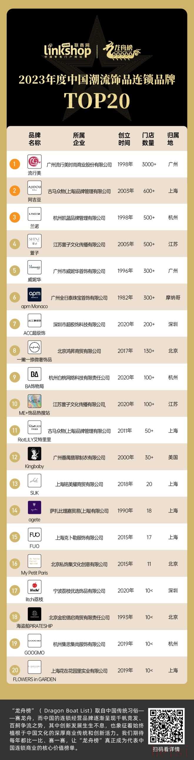 出品/聯(lián)商網(wǎng)撰文/王迪慧統(tǒng)計/王迪慧 羅秀玲隨著中國購物中心的高速成長和普及,中國大量的連鎖經(jīng)營品牌也憑借東風之力高速成長和擴張。《聯(lián)商網(wǎng)》秉持公開、公正、客觀的原則,推出2023年度連鎖品牌“龍舟榜”評選。“龍舟榜”(Dragon Boat List)取自中國傳統(tǒng)習俗——賽龍舟,而中國的連鎖經(jīng)營品牌逐漸呈現(xiàn)千帆競發(fā)、百舸爭流之勢,其中創(chuàng)新發(fā)展生生不息,也象征著始終植根于中國文化的深厚商業(yè)傳統(tǒng)和創(chuàng)新活力。我們期待每年都比一比、賽一賽, 讓“龍舟榜”真正成為代表中國連鎖商業(yè)的核心價值榜單。2020年,創(chuàng)業(yè)者和資本重新盯上飾品生意。這一年,以BA飾物局、Me+飾品熱搜站、ACC超級飾、洋蔥倉庫為代表的飾品集合店接連涌現(xiàn),不同于以往街邊的飾品小店,這些新型飾品集合店憑借超高性價比和沉浸式體驗吸引了更多年輕消費者的目光。受到資本青睞的新型飾品集合店,狂飆猛進,搶占一二線城市核心商圈內(nèi),實現(xiàn)快速開店,一時風頭無兩。然而,進入2022年,盛極一時的集合店似乎遇到坎兒了。剛開業(yè)時門庭若市的番茄口袋相繼關(guān)閉了三里屯的形象店以及位于合生匯的全國首店;曾獲得近千萬元天使輪融資的洋蔥倉庫位于成都太古里、上海環(huán)球港兩家門店也已關(guān)門,其微信公眾號在2022年9月18日發(fā)布季末清倉活動后便再無更新,其小紅書賬號最后一條更新時間還要追溯到2022年6月30日……短短時間經(jīng)歷大起大落的飾品集合店,目前在中國市場發(fā)展情況究竟如何?本期,《聯(lián)商網(wǎng)》評選出龍舟榜之“2023年度中國飾品連鎖品牌TOP20”,以門店數(shù)量為標準,輔以消費者好評度、融資情況,同時結(jié)合了多位行業(yè)人士的看法,以此探索飾品賽道的發(fā)展趨向。飾品集合店“卷土重來”從門店數(shù)量分布上看,TOP20品牌中大致可以分為四個等級,門店數(shù)量在1000+以上的品牌僅有流行美1家;500-1000家的僅有3家,分別是阿吉豆、蘭諾和萱子;100-500家的品牌有6家,100家以下的品牌有10家。