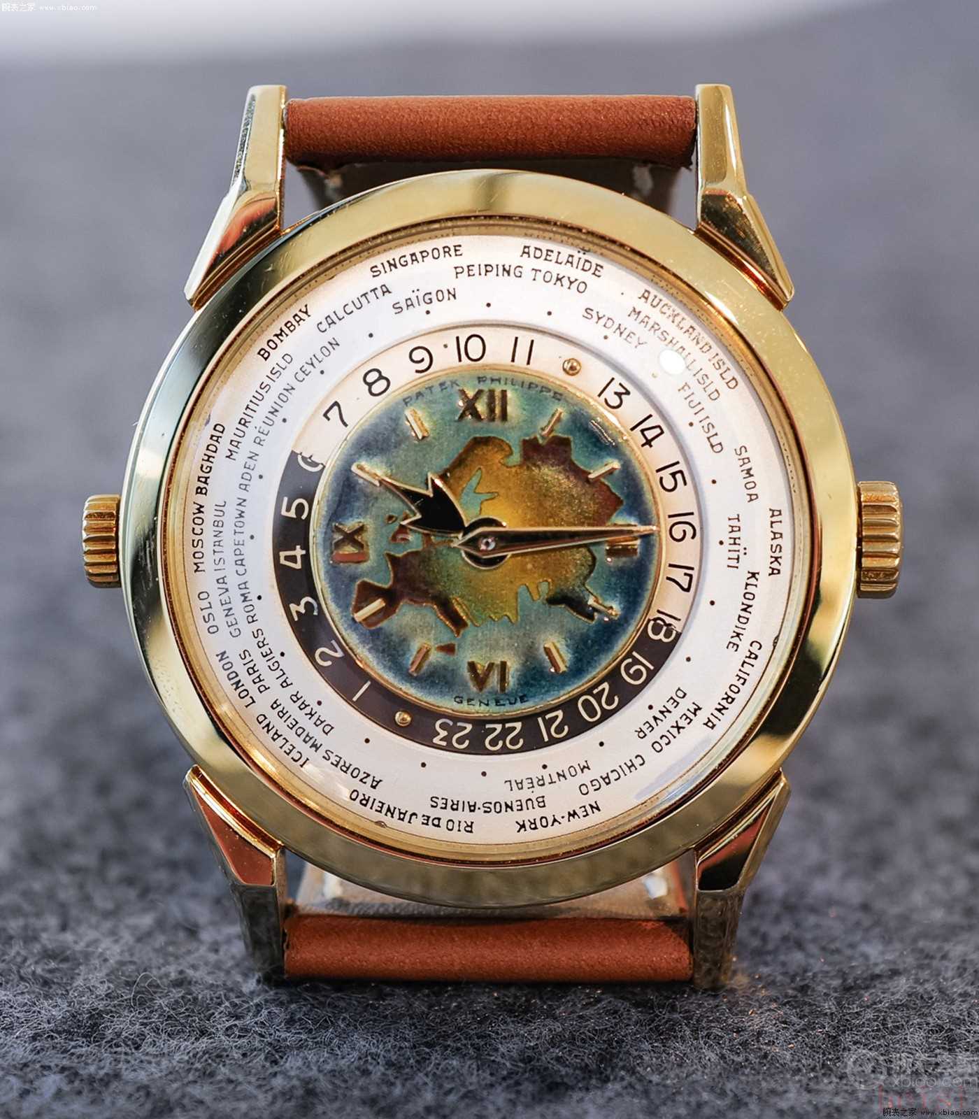 百達(dá)翡麗是歷史上第一個(gè)應(yīng)用現(xiàn)代世界功能的名表品牌(上世紀(jì)30年代)。而1953年問(wèn)世的2523是百達(dá)翡麗現(xiàn)代世界時(shí)的鼻祖。盤面有“歐亞大陸”掐絲琺瑯圖案,黃金殼的2523總共只存世3只,這是其中之一。