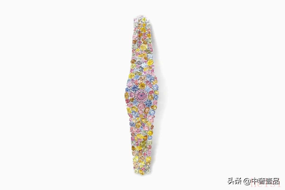這款價(jià)值2500萬美元的手表共有874顆鉆石,總重量為201克拉,顏色各異,是一線明星和皇室成員的最愛。買這款表更像是在買寶石,因?yàn)樗?5克拉粉色鉆石、12克拉藍(lán)色鉆石和11克拉白色鉆石。