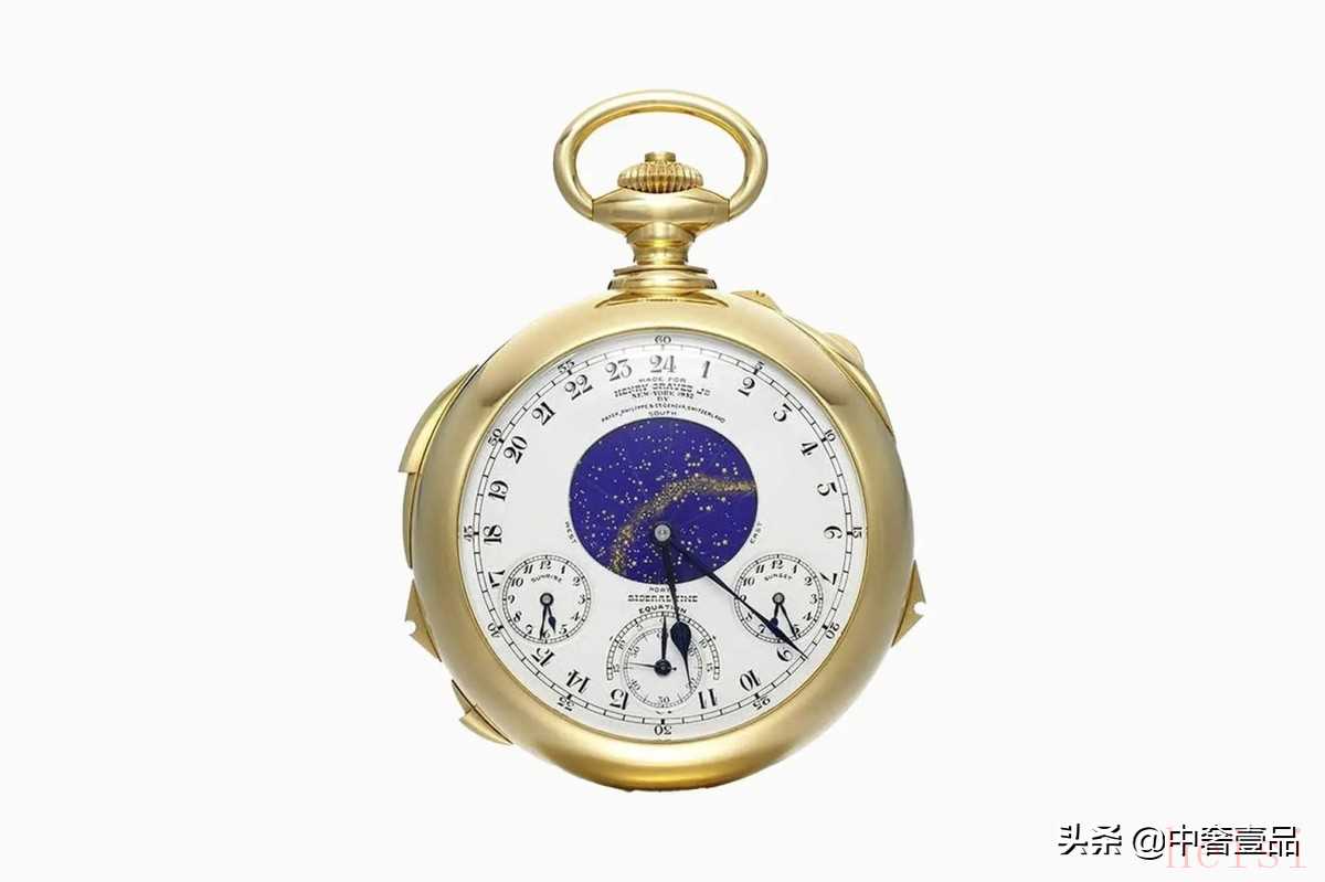 這款百達(dá)翡麗金懷表最初是1933年為美國銀行家亨利·格雷夫斯的制作的,它的設(shè)計(jì)和制造花費(fèi)了7年時(shí)間。作為世界上最昂貴的懷表之一,它令人印象深刻的復(fù)雜性包括萬年歷、帶有威斯敏斯特鐘聲的分鐘轉(zhuǎn)發(fā)器、日出和日落時(shí)間,以及從格雷夫斯在紐約的家中看去的夜空天體圖。