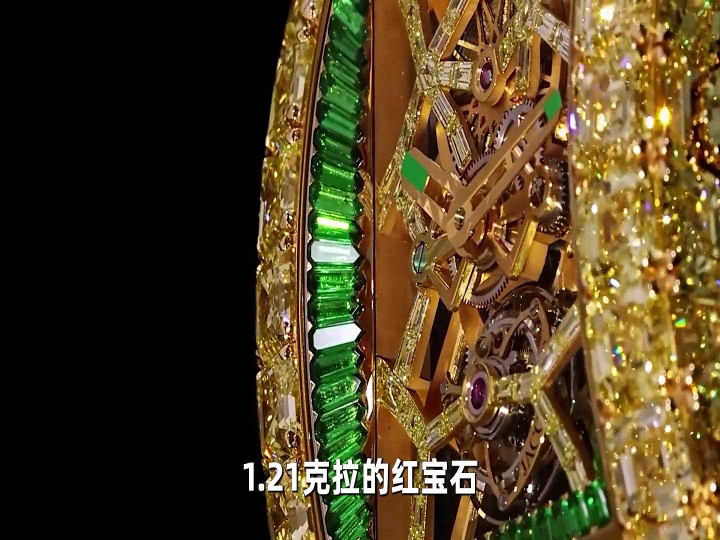 這款腕表的設(shè)計靈感來源于億萬富翁的生活,它不僅僅是一件計時工具,更是一件藝術(shù)品,是尊貴與財富的象征。從表盤到表帶,再到每一個細節(jié)都散發(fā)著奢華的氣息。腕表鑲有313顆祖母綠切割鉆石,總重約260克拉,這些鉆石每一顆都經(jīng)過精心挑選和切割。以確保它們能夠完美地鑲嵌在表盤上閃耀出璀璨的光芒。而表冠上則鑲嵌著一顆1.21克拉的紅寶石,它如同點睛之筆,為整款腕表增添了一抹亮麗的色彩。