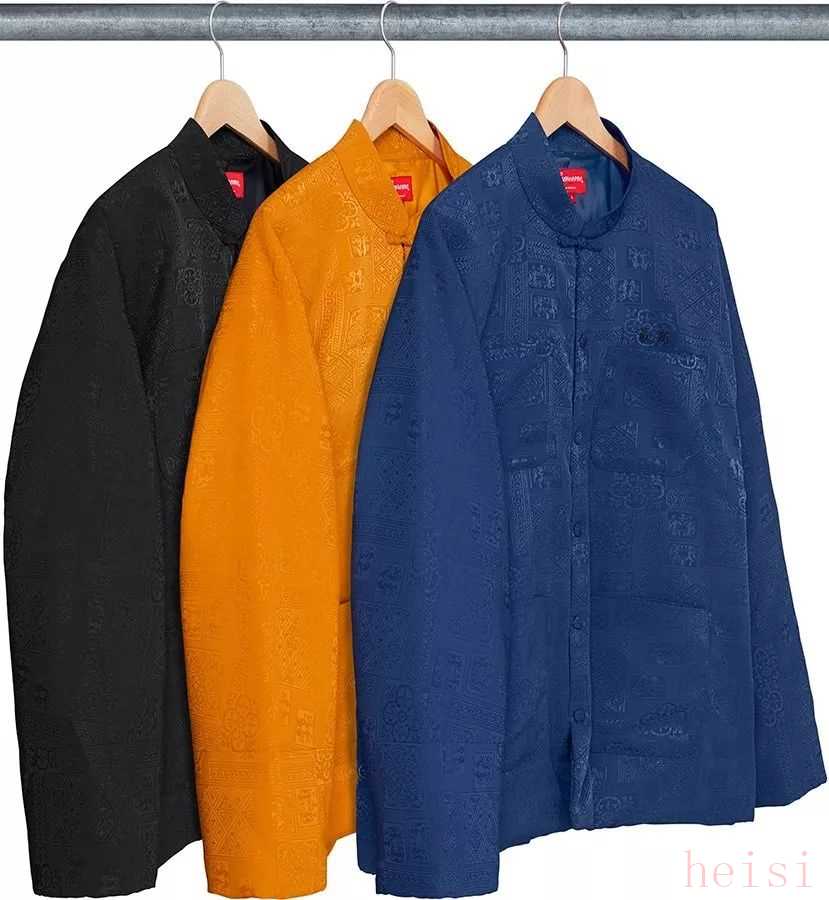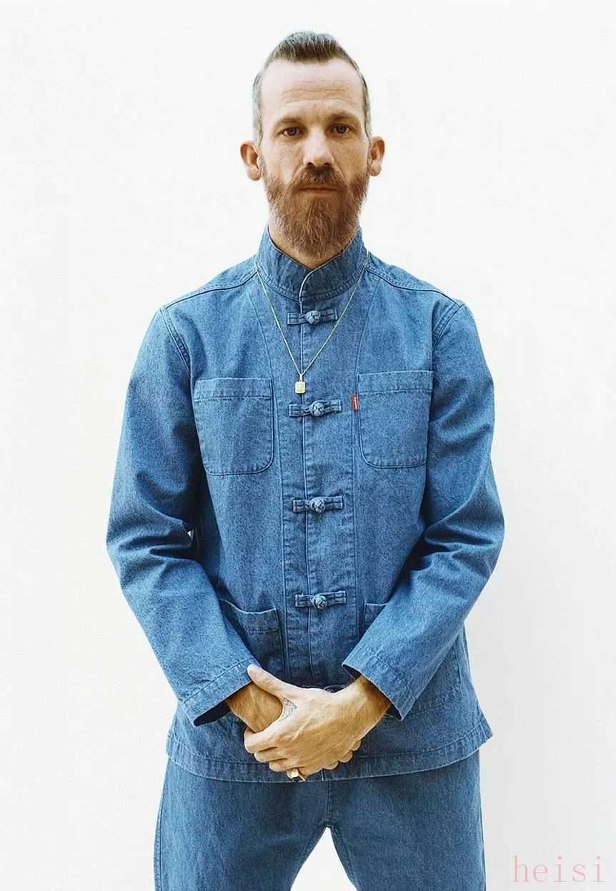 還有一直以來都對中國文化元素情有獨鐘的街頭之王 Supreme,在 2014 年春夏還有 2018 年春夏,也都推出過唐裝單品,前后兩次分別以牛仔和絲綢材質(zhì)呈現(xiàn)。