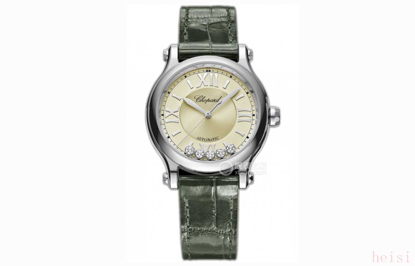 腕表點(diǎn)評(píng):蕭邦Happy Sport系列在女表友心中的地位始終都是很高的,從系列誕生就以“樂(lè)享生活”為主題,表達(dá)對(duì)于女性自由、自信和個(gè)性追求的鼓勵(lì)。33毫米的精鋼材質(zhì)表殼,經(jīng)過(guò)大面積拋光處理,厚度10.84毫米,表盤(pán)中央飾以璣鏤飾紋的象牙色表盤(pán),搭配棒狀時(shí)標(biāo)與羅馬數(shù)字,最引人矚目的自然還是放置在表盤(pán)內(nèi)部、兩層藍(lán)寶石水晶之間的七顆活動(dòng)鉆石,隨著在手腕運(yùn)動(dòng)時(shí)在表盤(pán)中不?!拔鑴?dòng)”。靈動(dòng)的鉆石不再僅僅是禁錮在表盤(pán)上的裝飾,更加像是自由的靈魂,灑脫也美麗。內(nèi)部搭載的是蕭邦專為女表開(kāi)發(fā)的09.01-C自動(dòng)上鏈機(jī)械機(jī)芯,振頻為3.5赫茲(每小時(shí)25,200次),具備約42小時(shí)動(dòng)力儲(chǔ)備,以及具有約30米的防水能力。此外為了搭配象牙色的盤(pán)面,品牌配備了一條灰綠色鱷魚(yú)皮表帶搭配針扣,與表盤(pán)呼應(yīng)效果十分出彩。