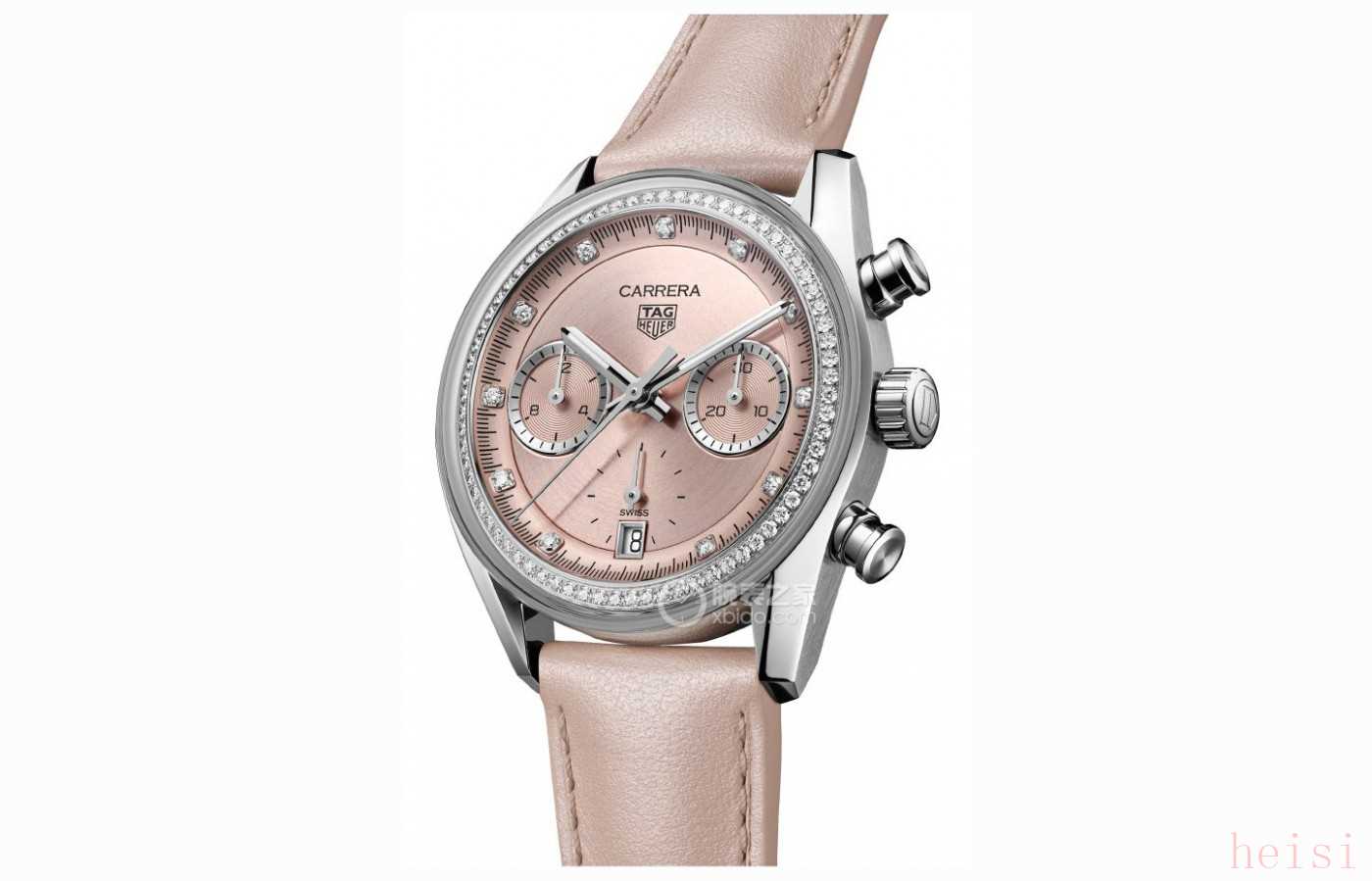 腕表點(diǎn)評(píng):這款泰格豪雅卡萊拉系列計(jì)時(shí)碼表霧粉色(型號(hào):CBS2215.FC6568)在我看來(lái)是近幾年中帶鉆腕表且在進(jìn)階價(jià)位的顏值、性能雙巔峰。39毫米表殼經(jīng)精細(xì)磨砂拋光處理,且外緣鑲嵌總重達(dá)0.45克拉的72顆鉆石,再加上11顆爪鑲鉆石時(shí)標(biāo)沿表盤(pán)內(nèi)緣排列,與表盤(pán)內(nèi)緣弧度相得益彰,總重達(dá)0.107克拉。表盤(pán)采用bi-compax雙盤(pán)結(jié)構(gòu),6點(diǎn)鐘位置以小秒盤(pán)和日歷窗合二為一,3點(diǎn)位30分鐘計(jì)時(shí)盤(pán)與9點(diǎn)位12小時(shí)累計(jì)計(jì)時(shí)盤(pán)相互呼應(yīng),并通過(guò)唱片紋裝飾。拋光鍍銠刻面的指針覆以白色Super-LumiNova?熒光涂料,此外還具備有100米的防水能力。內(nèi)部搭載TH20-00自動(dòng)上鏈機(jī)械機(jī)芯,振頻28800次/時(shí),具備有80小時(shí)的動(dòng)儲(chǔ)。在表帶搭配上選擇了同色系的霧粉色珠光小牛皮表帶,不管是性價(jià)比還是整體質(zhì)感和顏值上,泰格豪雅絕對(duì)是同等價(jià)位內(nèi)最好的選擇之一。