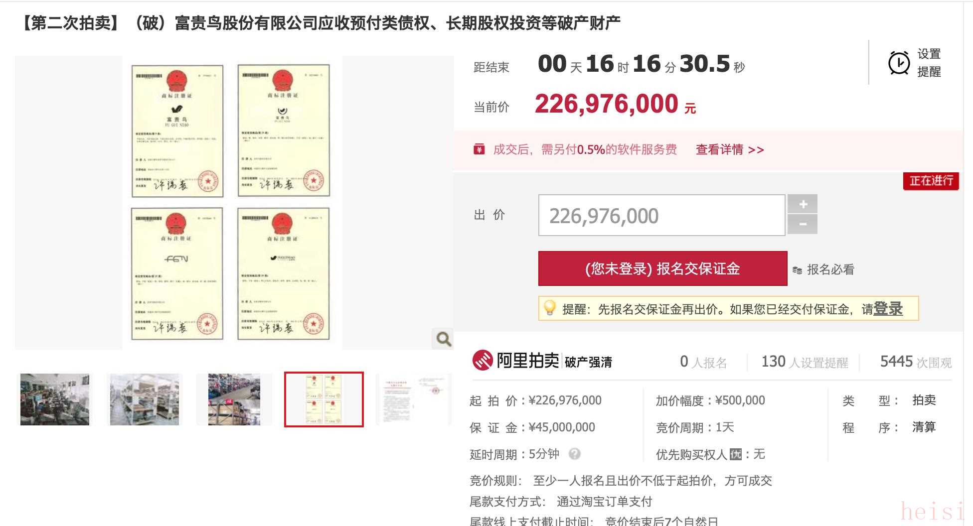 一周之后,富貴鳥公司重啟拍賣流程,這一次的起拍價(jià)下調(diào)至2.27億,相較第一次打了八折。即便如此,截至10月17日10時(shí)二次開拍,仍未有人報(bào)名參與。