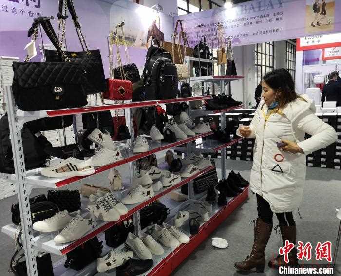 一位女士正在博覽會(huì)選購(gòu)鞋子。 唐小晴 攝